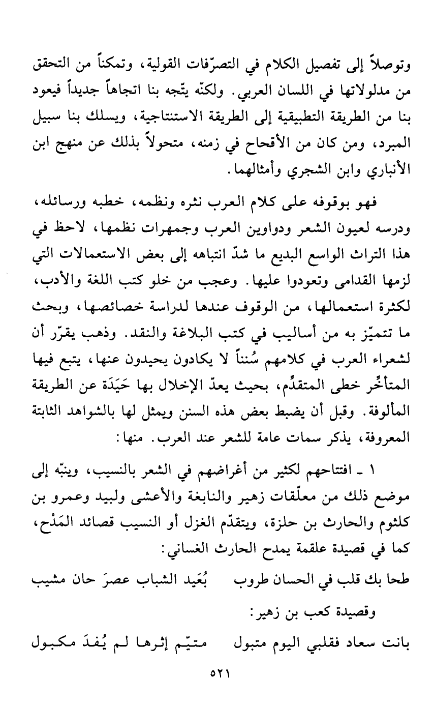 فهو بوقوفه على كلام العرب نثره ونظمه، خطبه ورسائله، ودرسه لعيون الشعر ودواوين العرب وجمهرات نظمها، لاحظ في هذا التراث الواسع البديع ما شدّ انتباهه إلى بعض الاستعمالات التي لزمها القدامى وتعودوا عليها. وعجب من خلو كتب اللغة والأدب، لكثرة استعمالها، من الوقوف عندها لدراسة خصائصها، وبحث ما تتميّز به من أساليب في كتب البلاغة والنقد. وذهب يقرّر أن لشعراء العرب في كلامهم سُنناً لا يكادون يحيدون عنها، يتبع فيها المتأخِّر خطى المتقدِّم، بحيث يعدّ الإخلال بها حَيَدَة عن الطريقة المألوفة. وقبل أن يضبط بعض هذه السنن ويمثل لها بالشواهد الثابتة المعروفة، يذكر سمات عامة للشعر عند العرب. منها: