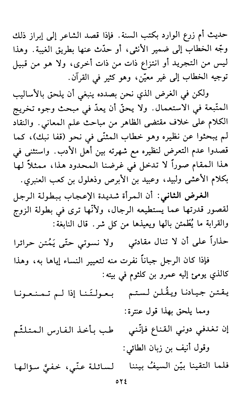حديث أم زرع الوارد بكتب السنة. فإذا قصد الشاعر إلى إبراز ذلك وجّه الخطاب إلى ضمير الأنثى، أو حدّث عنها بطريق الغيبة. وهذا ليس من التجريد أو انتزاع ذات من ذات أخرى، ولا هو من قبيل توجيه الخطاب إلى غير معيّن، وهو كثير في القرآن.