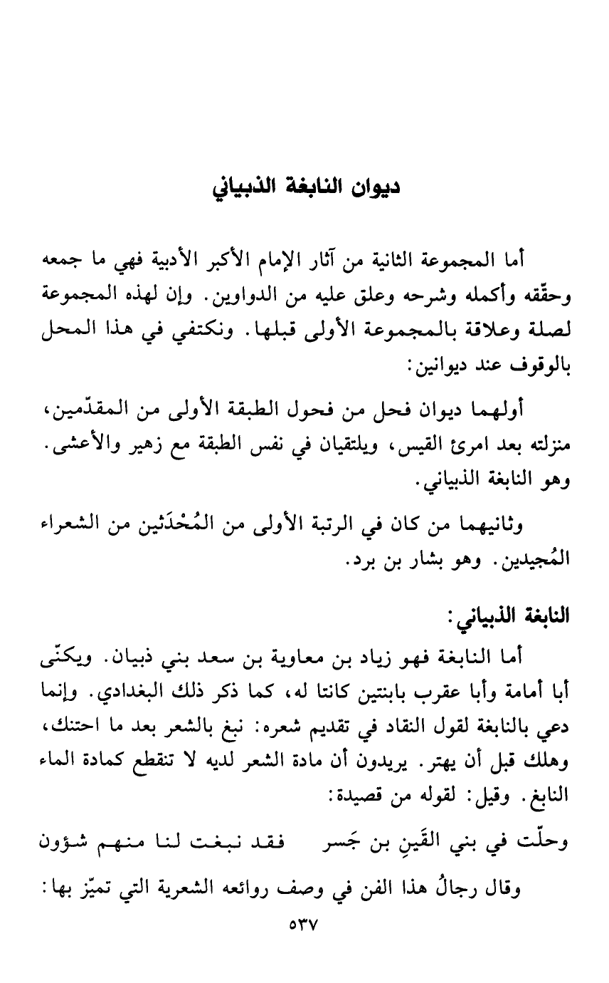 أولهما ديوان فحل من فحول الطبقة الأولى من المقدّمين، منزلته بعد امرىء القيس، ويلتقيان في نفس الطبقة مع زهير والأعشى. وهو النابغة الذبياني.