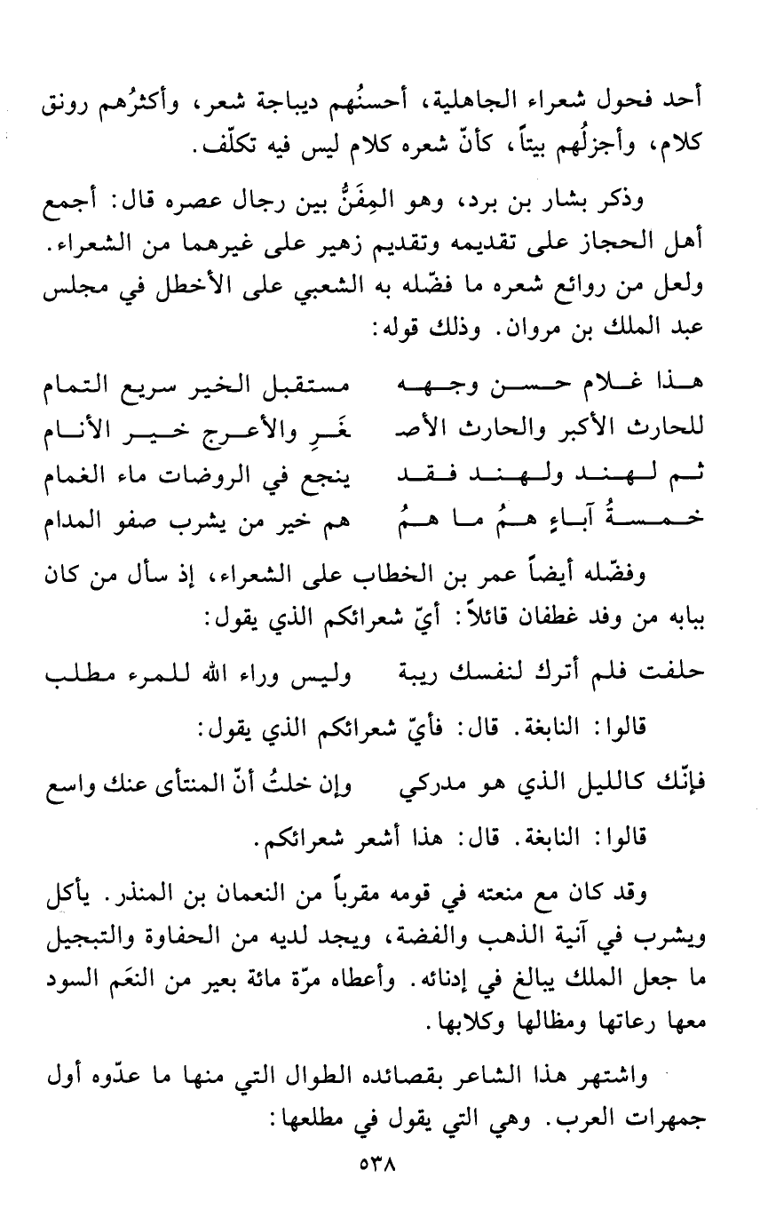 أحد فحول شعراء الجاهلية، أحسنُهم ديباجة شعر، وأكثرُهم رونق كلام، وأجزلُهم بيتاً، كأنّ شعره كلام ليس فيه تكلّف.