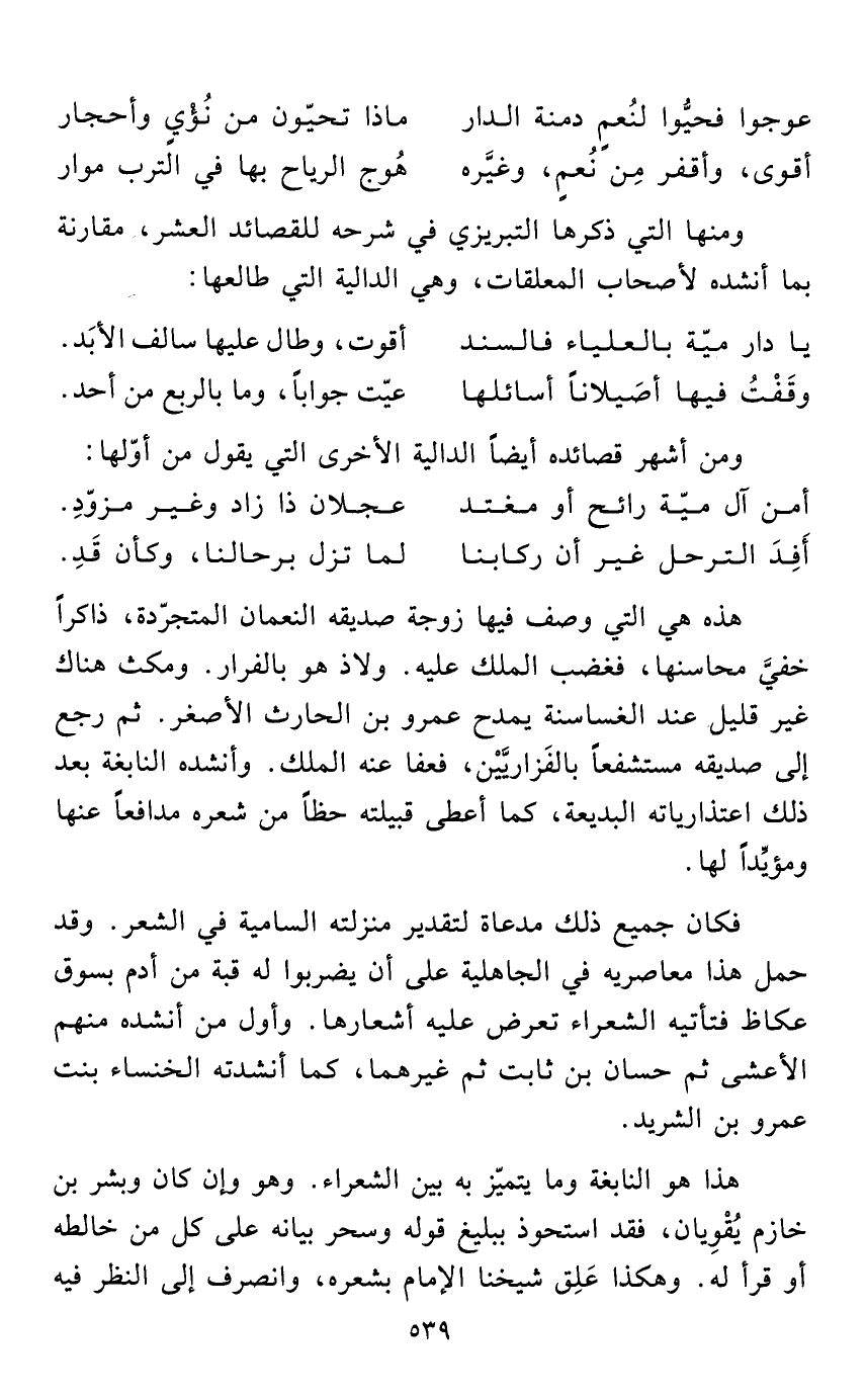 هذا هو النابغة وما يتميّز به بين الشعراء. وهو وإن كان وبشر بن خازم يُقْوِيان، فقد استحوذ ببليغ قوله وسحر بيانه على كل من خالطه أو قرأ له. وهكذا عَلِق شيخنا الإمام بشعره، وانصرف إلى النظر فيه