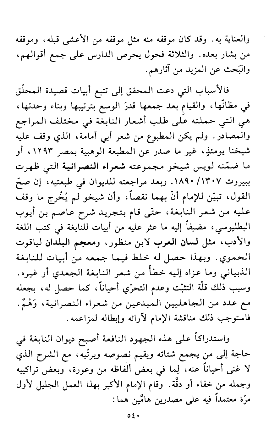 واستدراكاً على هذه الجهود النافعة أصبح ديوان النابغة في حاجة إلى من يجمع شتاته ويقيم نصوصه ويرتّبه، مع الشرح الذي لا غنى أحياناً عنه، لِما في بعض ألفاظه من وعورة، وبعض تراكيبه وجمله من خفاء أو دقَّة. وقام الإمام الأكبر بهذا العمل الجليل لأول مرّة معتمداً فيه على مصدرين هامَّين هما: