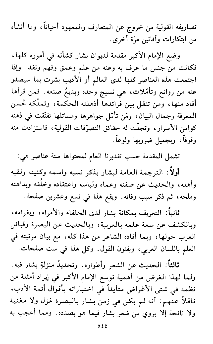 ثانياً: التعريف بمكانة بشار لدى الخلفاء والأمراء، وبغرامه، وبالكشف عن سعة علمه بالعربية، وبالحديث عن البصرة وقبائل العرب حولها، وبما أفاده الشاعر من هذا كله، مع بيان مرتبته في العلم باللسان العربي، وبفنون القول. وكل هذا في ست صفحات.