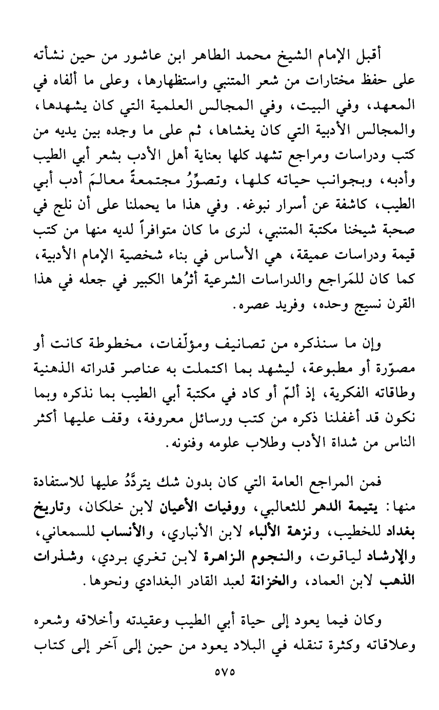 أقبل الإمام الشيخ محمد الطاهر ابن عاشور من حين نشأته على حفظ مختارات من شعر المتنبي واستظهارها، وعلى ما ألفاه في المعهد، وفي البيت، وفي المجالس العلمية التي كان يشهدها، والمجالس الأدبية التي كان يغشاها، ثم على ما وجده بين يديه من كتب ودراسات ومراجع تشهد كلها بعناية أهل الأدب بشعر أبي الطيب وأدبه، وبجوانب حياته كلها، وتصوِّرُ مجتمعةً معالمَ أدب أبي الطيب، كاشفة عن أسرار نبوغه. وفي هذا ما يحملنا على أن نلج في صحبة شيخنا مكتبة المتنبي، لنرى ما كان متوافراً لديه منها من كتب قيمة ودراسات عميقة، هي الأساس في بناء شخصية الإمام الأدبية، كما كان للمَراجع والدراسات الشرعية أثرُها الكبير في جعله في هذا القرن نسيج وحده، وفريد عصره.