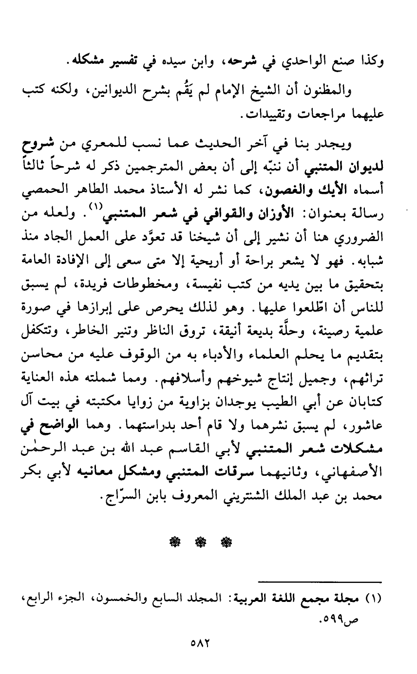 ويجدر بنا في آخر الحديث عما نسب للمعري من شروح لديوان المتنبي أن ننبّه إلى أن بعض المترجمين ذكر له شرحاً ثالثاً أسماه الأيك والغصون، كما نشر له الأستاذ محمد الطاهر الحمصي رسالة بعنوان: الأوزان والقوافي في شعر المتنبي (¬1). ولعله من الضروري هنا أن نشير إلى أن شيخنا قد تعوَّد على العمل الجاد منذ شبابه. فهو لا يشعر براحة أو أريحية إلا متى سعى إلى الإفادة العامة بتحقيق ما بين يديه من كتب نفيسة، ومخطوطات فريدة، لم يسبق للناس أن اطّلعوا عليها. وهو لذلك يحرص على إبرازها في صورة علمية رصينة، وحلَّة بديعة أنيقة، تروق الناظر وتنير الخاطر، وتتكفل بتقديم ما يحلم العلماء والأدباء به من الوقوف عليه من محاسن تراثهم، وجميل إنتاج شيوخهم وأسلافهم. ومما شملته هذه العناية كتابان عن أبي الطيب يوجدان بزاوية من زوايا مكتبته في بيت آل عاشور، لم يسبق نشرهما ولا قام أحد بدراستهما. وهما الواضح في مشكلات شعر المتنبي لأبي القاسم عبد الله بن عبد الرحمن الأصفهاني، وثانيهما سرقات المتنبي ومشكل معانيه لأبي بكر محمد بن عبد الملك الشنتريني المعروف بابن السرّاج.