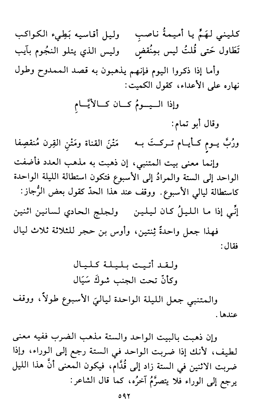وإنما معنى بيت المتنبي، إن ذهبت به مذهب العدد فأضفت الواحد إلى الستة والمرادُ إلى الأسبوع فتكون استطالة الليلة الواحدة كاستطالة ليالي الأسبوع. ووقف عند هذا الحدّ كقول بعض الرُّجاز: