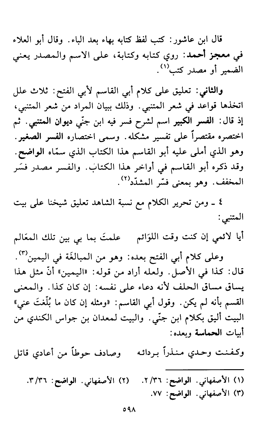 والثاني: تعليق على كلام أبي القاسم لأبي الفتح: ثلاث علل اتخذها قواعد في شعر المتنبي. وذلك ببيان المراد من شعر المتنبي، إذ قال: الفسر الكبير اسم لشرح فسر فيه ابن جني ديوان المتنبي. ثم اختصره مقتصراً على تفسير مشكله. وسمى اختصاره الفسر الصغير. وهو الذي أملى عليه أبو القاسم هذا الكتاب الذي سمّاه الواضح. وقد ذكره أبو القاسم في أواخر هذا الكتاب. والفسر مصدر فسَر المخفف. وهو بمعنى فسّر المشدّد (¬2).