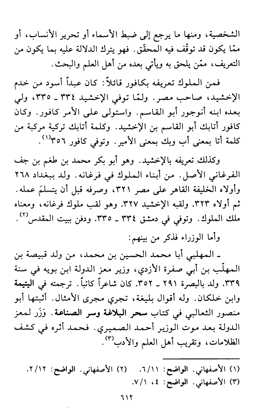 وكذلك تعريفه بالإخشيد. وهو أبو بكر محمد بن طغم بن جف الفرغاني الأصل. من أبناء الملوك في فرغانه. ولد ببغداد 268 وأولاه الخليفة القاهر على مصر 321، وصرفه قبل أن يتسلمَ عمله. ثم أولاه 323. ولقبه الإخشيد 327. وهو لقب ملوك فرغانه، ومعناه ملك الملوك. وتوفي في دمشق 334 - 335. ودفن ببيت المقدس (¬2).