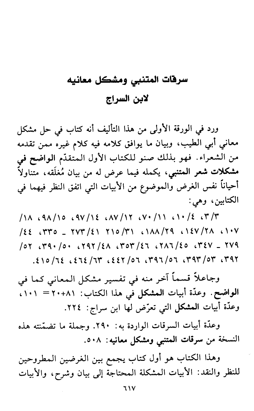 وعدّة أبيات السرقات الواردة به: 290. وجملة ما تضمّنته هذه النسخة من سرقات المتنبي ومشكل معانيه: 508.