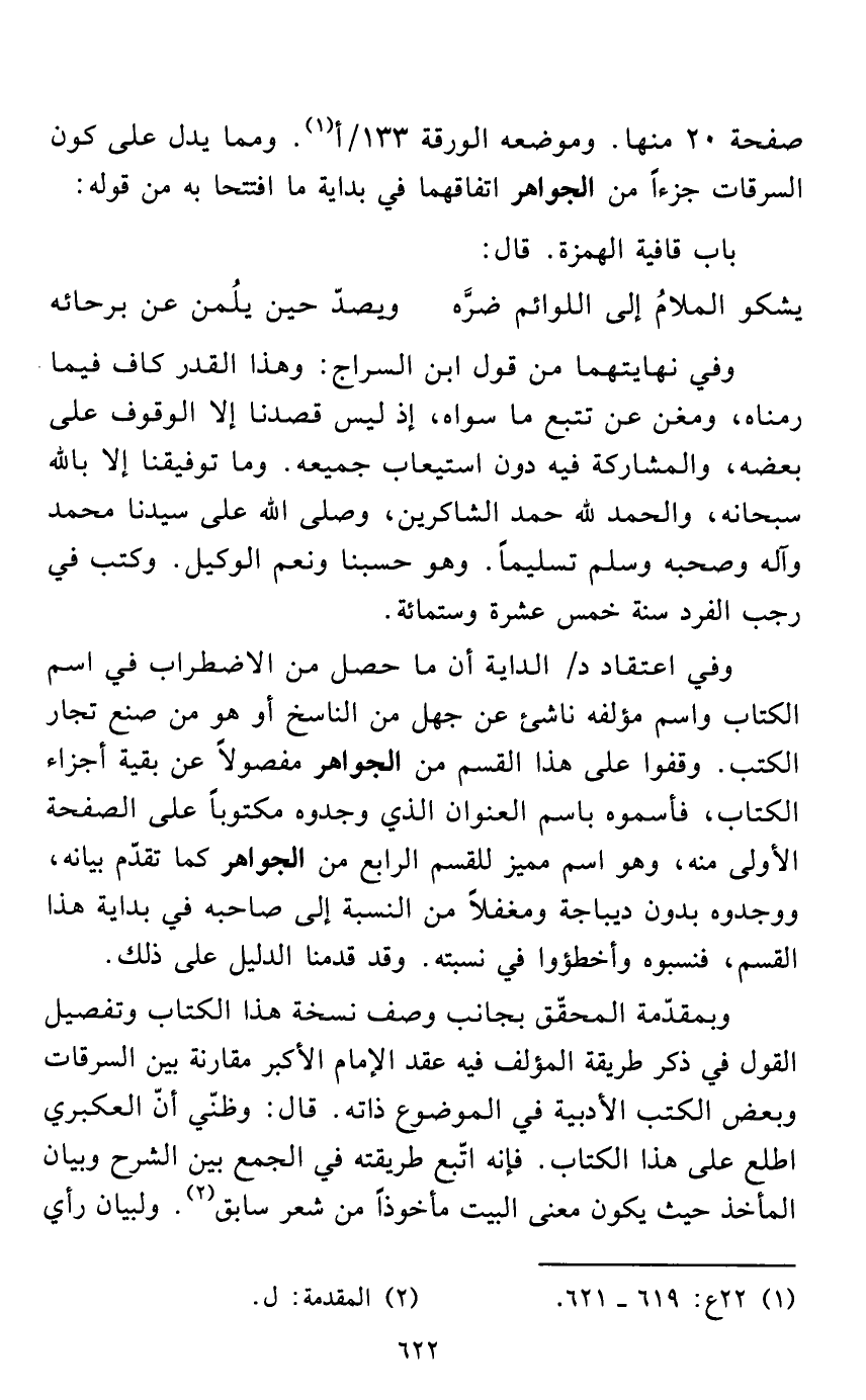 صفحة 20 منها. وموضعه الورقة 133/ أ (¬1). ومما يدل على كون السرقات جزءاً من الجواهر اتفاقهما في بداية ما افتتحا به من قوله: