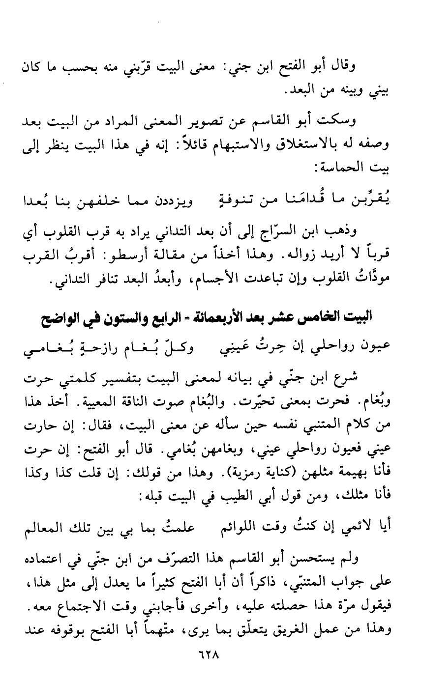 شرع ابن جنّي في بيانه لمعنى البيت بتفسير كلمتي حرت وبُغام. فحرت بمعنى تحيّرت. والبُغام صوت الناقة المعيية. أخذ هذا من كلام المتنبي نفسه حين سأله عن معنى البيت، فقال: إن حارت عيني فعيون رواحلي عيني، وبغامهن بُغامي. قال أبو الفتح: إن حرت فأنا بهيمة مثلهن (كناية رمزية). وهذا من قولك: إن قلت كذا وكذا فأنا مثلك، ومن قول أبي الطيب في البيت قبله: