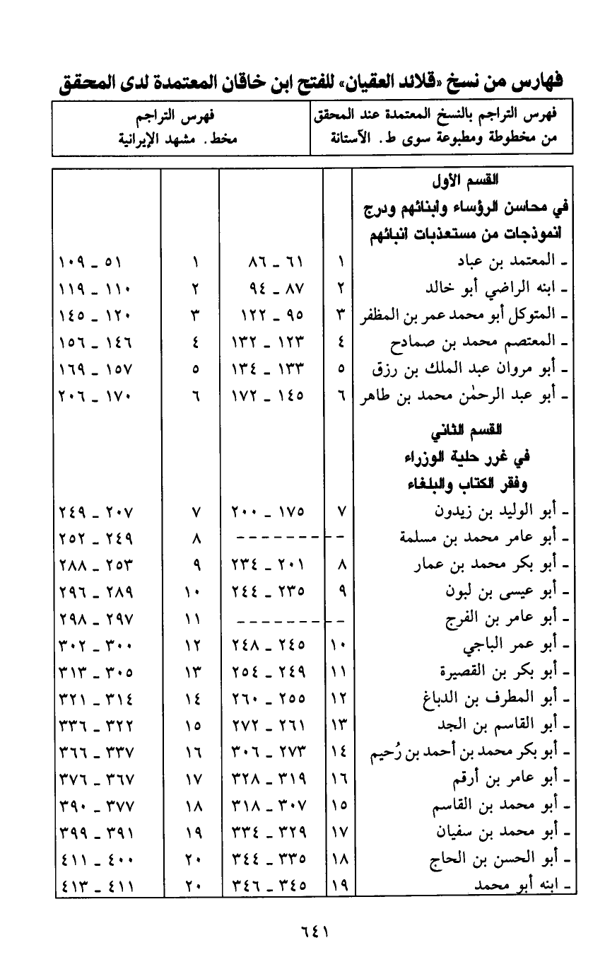فهارس من نسخ "قلائد العقيان" للفتح ابن خاقان المعتمدة لدى المحقق