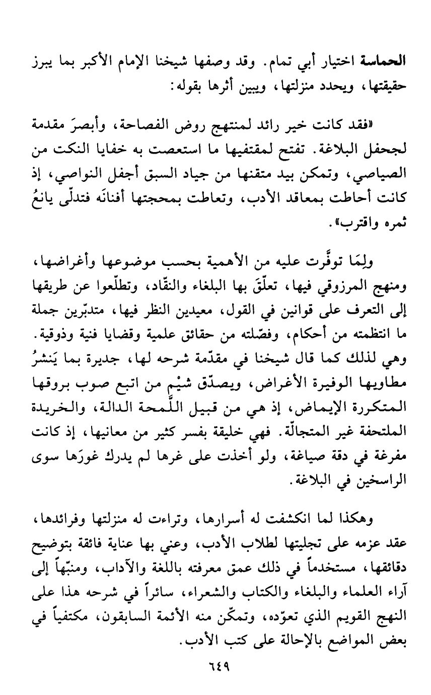 الحماسة اختيار أبي تمام. وقد وصفها شيخنا الإمام الأكبر بما يبرز حقيقتها، ويحدد منزلتها، ويبين أثرها بقوله: