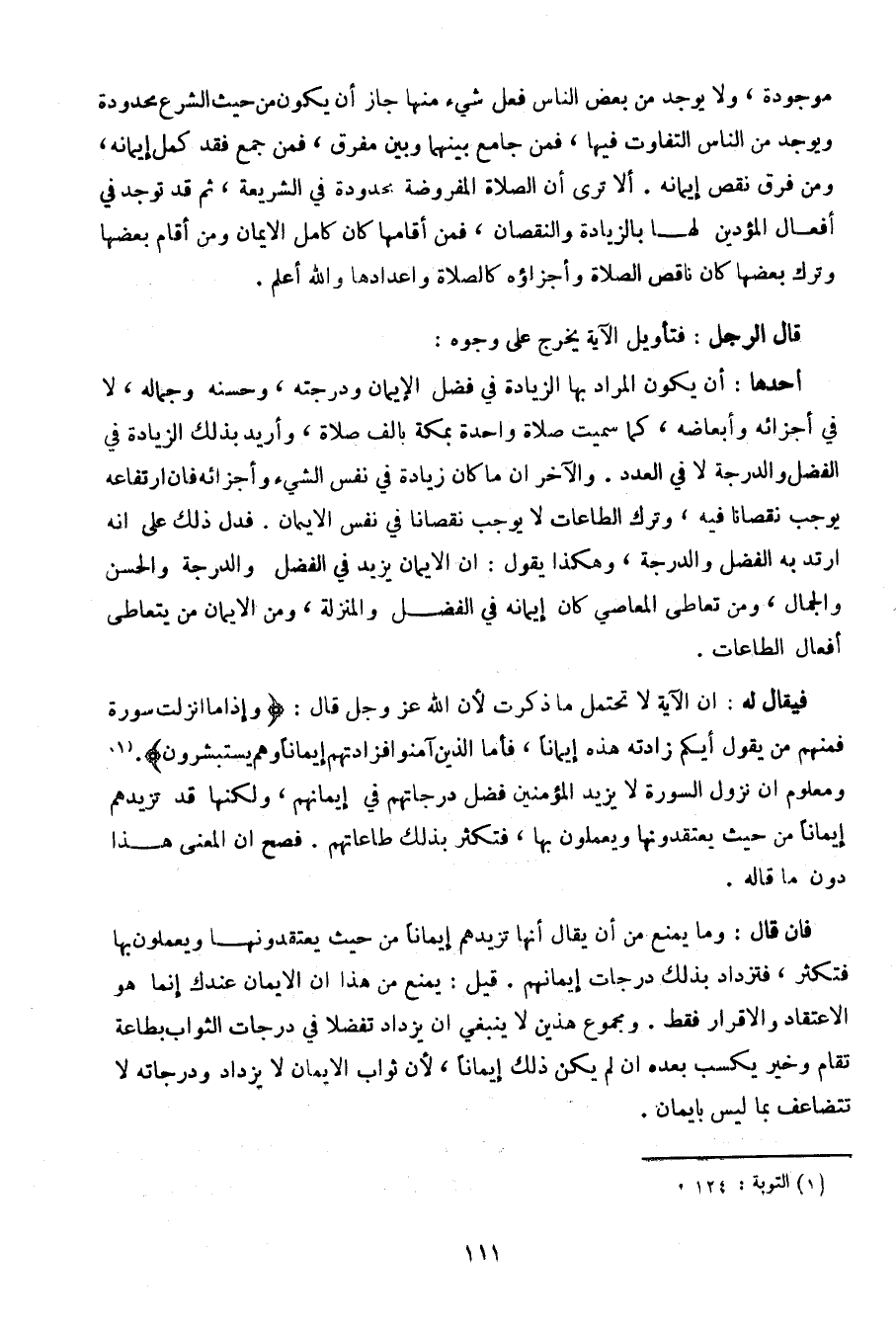أحدها: أن يكون المراد بها الزيادة في فضل الإيمان ودرجته، وحسنه وجماله، لا في أجزائه وأبعاضه، كما سميت صلاة واحدة بمكة بألف صلاة، وأريد بذلك الزيادة في الفضل والدرجة لا في العدد. والآخر إن ما كان زيادة في نفس الشيء وأجزائه فإن ارتفاعه يوجب نقصانا فيه، وترك الطاعات لا يوجب نقصانا في نفس الإيمان. فدل ذلك على أنه ارتد به الفصل والدرجة، وهكذا يقول: إن الإيمان يزيد في الفضل والدرجة والحسن والجمال، ومن تعاطى المعاصي كأن إيمانه في الفضل والمنزلة، ومن الإيمان من يتعاطى أفعال الطاعات.