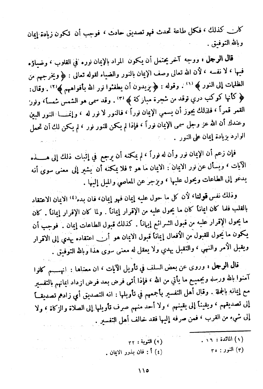 قال الرجل: ووجه آخر يحتمل أن يكون المراد بالإيمان نوره في القلوب، وضياؤه فيها، لا نفسه، لأن الله تعالى وصف الإيمان بالنور والضياء لقوله تعالى: {ويخرجهم من الظلمات إلى النور}. وقوله: {يريدون أن يطفئوا نور الله بأفواههم}. وقال: {كأنها كوكب دري توقد من شجرة مباركة}. وقد سمى هو الشمس شمسا، ونور القمر قمرا، فلذلك يجوز أن يسمي الإيمان نورا، فالنور لا نور له، وإنما النور البين وعندك أن الله عز وجل سمى الإيمان نورا، فإذا لم يكن للنور نور، لم يكن لك أن تحمل الوارد بزيادة إيمان على النور.