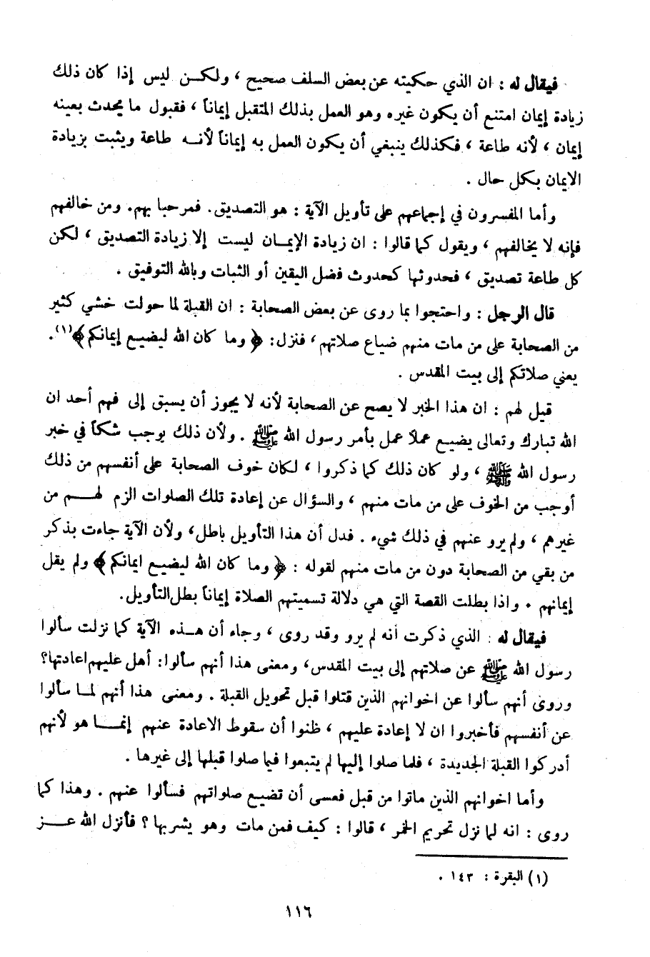 قال الرجل: واحتجوا بما روي عن بعض الصحابة: أن القبلة لما حولت خشي كثير من الصحابة على من مات منهم ضياع صلاتهم، فنزل: {وما كان الله ليضيع إيمانكم}. يعني صلاتكم إلى بيت المقدس.
