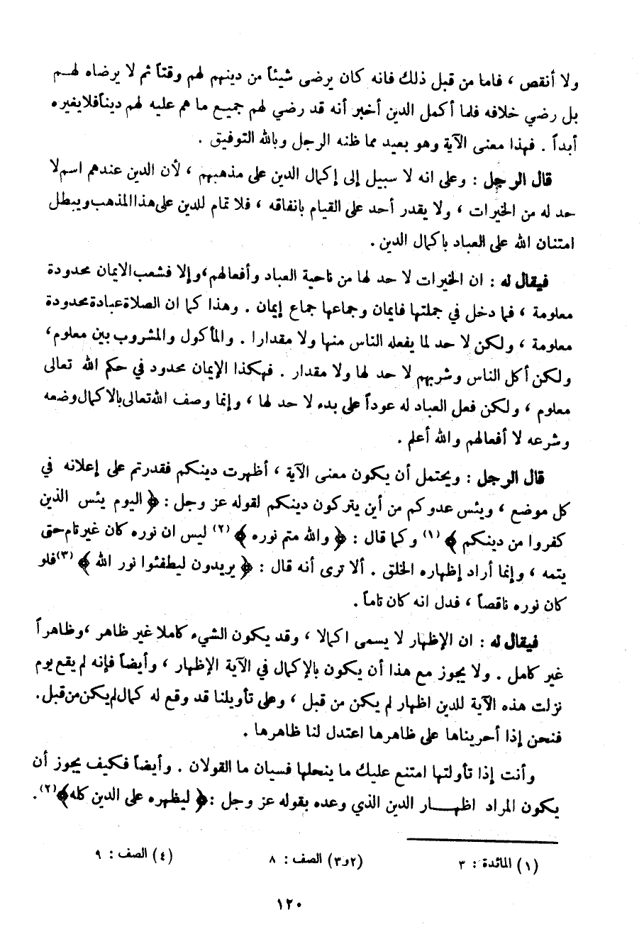 فيقال له: إن الإظهار لا يسمى إكمالا، وقد يكون الشيء كاملا غير ظاهر، وظاهرا غير كامل. ولا يجوز مع هذا أن يكون بالإكمال في الآية الإظهار، وأيضا فإنه لم يقع يوم نزلت هذه الآية للدين إظهار لم يكن من قبل، وعلى تأويلنا قد وقع له كمال لم يكن من قبل. فنحن إذا أجريناها على ظاهرها اعتدل لنا ظوارها.