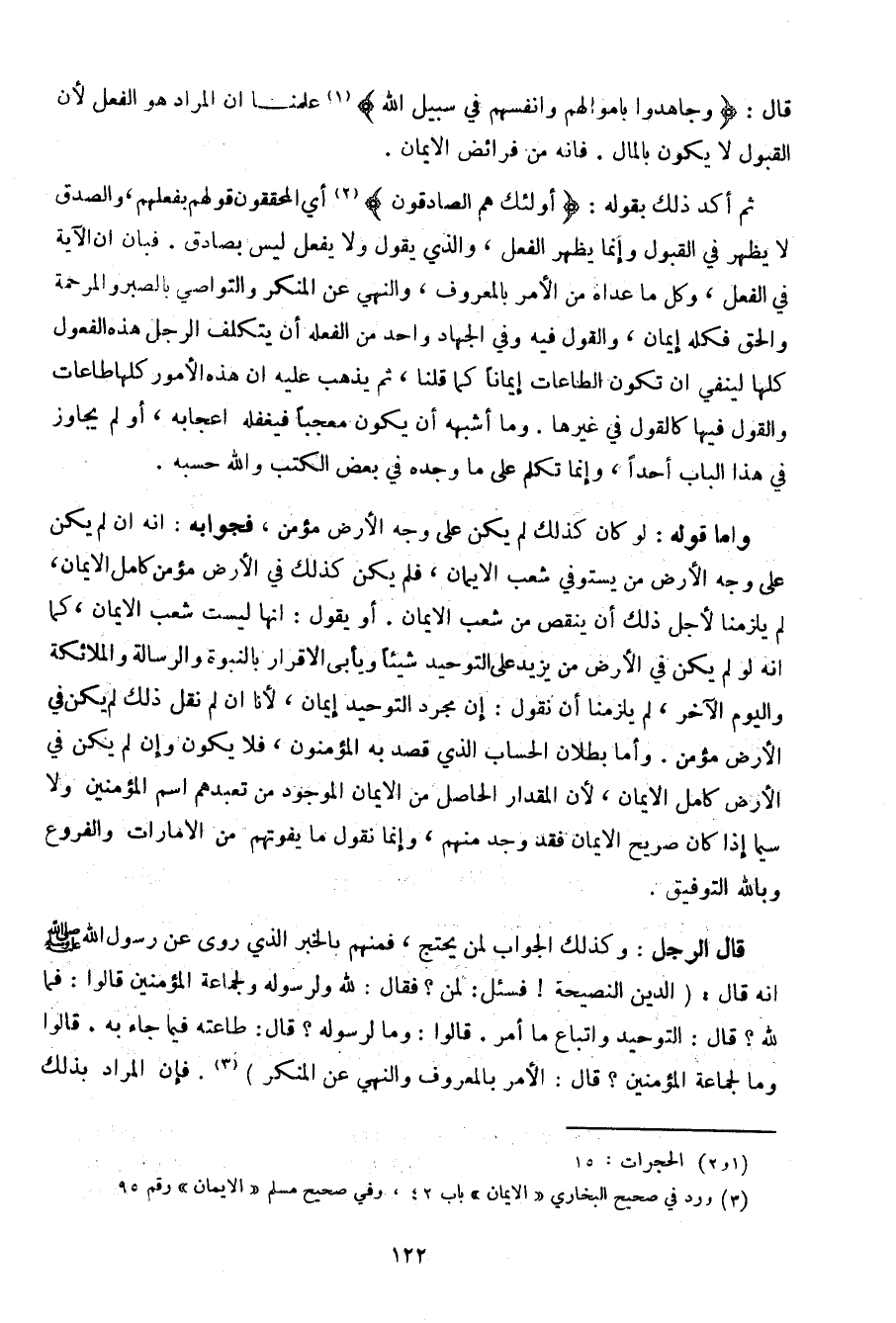 ثم أكد ذلك بقوله: {أولئك هم الصادقون} أي المحققون قولهم بفعلهم، والصدق لا يظهر في القبول وإنما يظهر الفعل، والذي يقول ولا يفعل ليس بصادق, فبان أن الآية في الفعل، وكل ما عداه من الأمر بالمعروف، والنهي عن المنكر والتواصي بالصبر والمرحمة والحق فكله إيمان، والقول فيه وفي الجهاد واحد من الفعلة أن يتكلف الرجل هذه الفعول كلها لينفي أن تكون الطاعات إيمانا كما قلنا، ثم يذهب عليه أن هذه الأمور كلها طاعات والقول فيها كالقول في غيرها. وما أشبهه أن يكون معجبا فيغفله إعجابه، أو لم يجاوز في هذا الباب أحدا، وإنما تكلم على ما وجده في بعض الكتب والله حسبه.