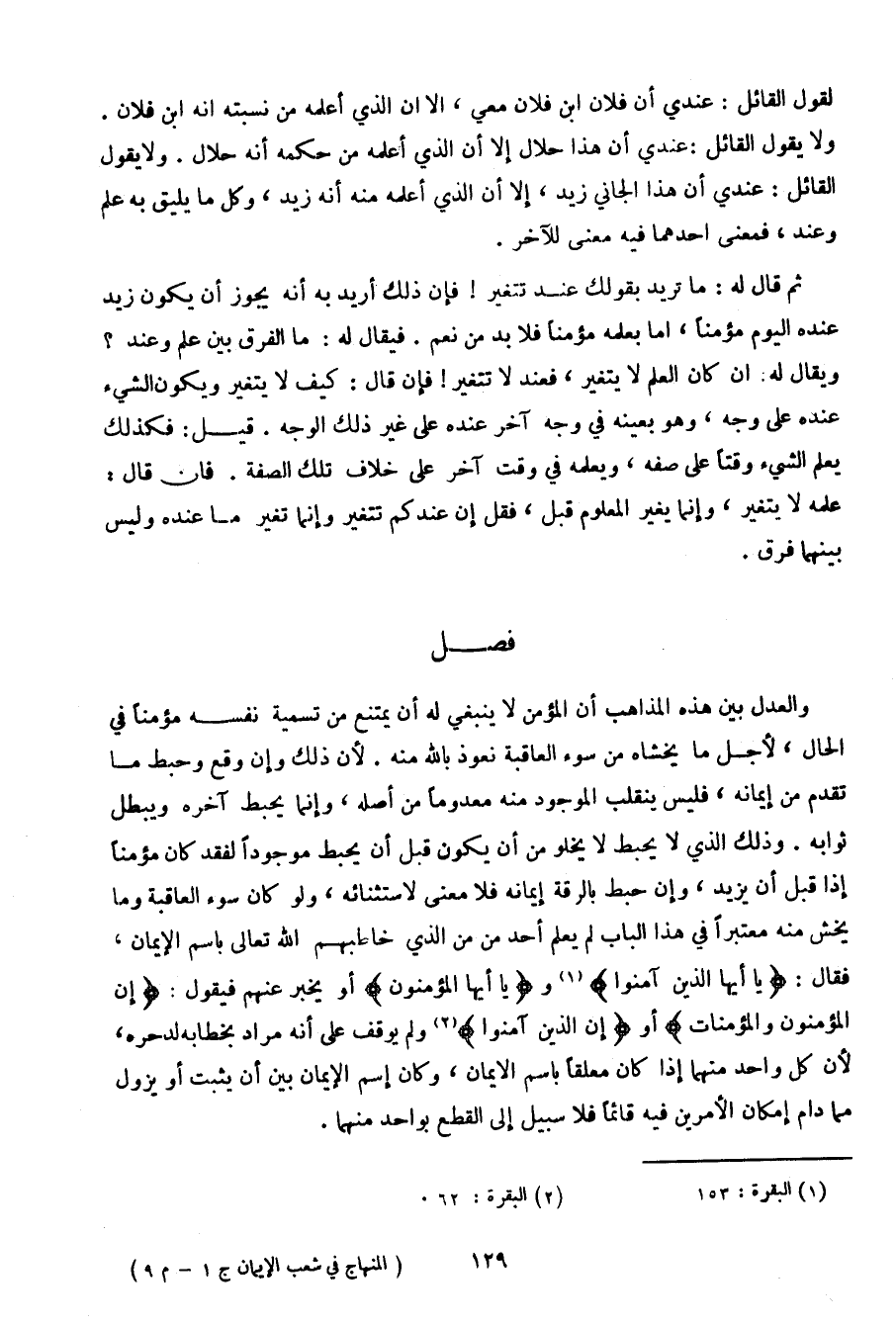 والعدل بين هذه المذاهب أن المؤمن لا ينبغي له أن يمتنع من تسمية نفسه مؤمنا في الحال، لأجل ما يخشاه من سوء العاقبة نعوذ بالله منه. لأن ذلك وإن وقع وحبط ما تقدم من إيمانه، فليس ينقلب الموجود منه معدوما من أصله، وإنما يحبط آخره ويبطل ثوابه. وذلك الذي لا يحبط لا يخلو من أن يكون قبل أن يحبط موجودا لفقد كان مؤمنا إذا قبل أن يزيد، وإن حبط بالرقة إيمانا فلا معنى لاستثنائه، ولو كان سوء العاقبة وما يخش منه معتبرا في هذا الباب لم يعلم أحد من الذي خاطبهم الله تعالى باسم الإيمان، فقال: {يا أيها الذين آمنوا} و {يا أيها المؤمنون} أو يخبر عنهم فيقول: {إن المؤمنون والمؤمنات} أو {إن الذين آمنوا} ولم يوقف على أنه مراد بخطابه لدحره، لأن كل واحد منهما إذا كان معلقا باسم الإيمان، وكان اسم الإيمان بين أن يثبت أو يزول مما دام إمكان الأمرين فيه قائما فلا سبيل إلى القطع بواحد منهما.