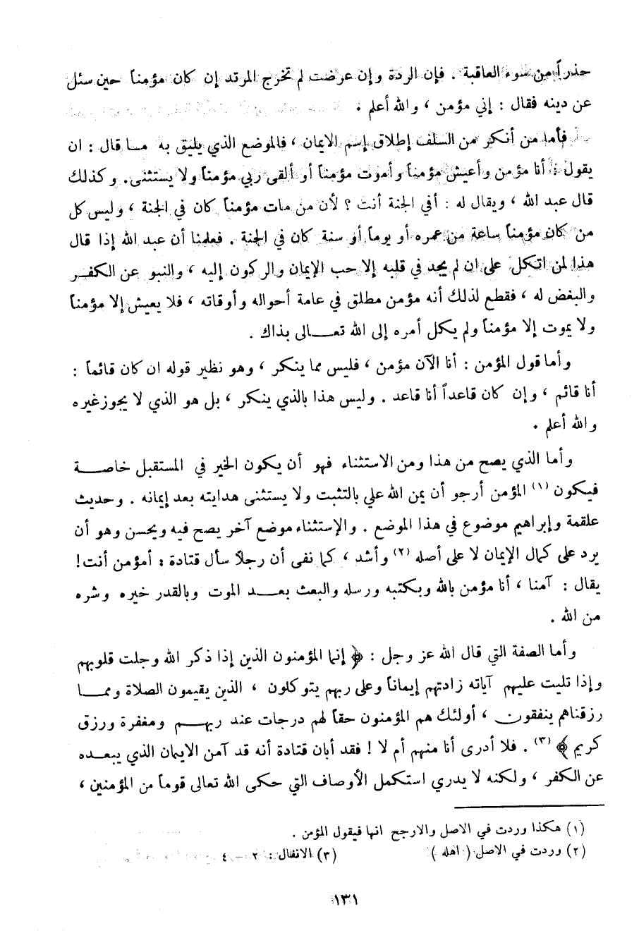 فأما من أنكر من السلف إطلاق اسم الإيمان، فالموضع الذي يليق به ما قال: أن يقول: أنا مؤمن وأعيش مؤمنا وأموت مؤمنا أو ألقى رب مؤمنا ولا يستثني. وكذلك قال عبد الله، ويقال له: أفي الجنة أنت؟ لأن من مات مؤمنا كان في الجنة، وليس كل من كان مؤمنا ساعة من عمره أو يوما أو سنة كان في الجنة. فعلمنا أن عبد الله إذا قال هذا لمن اتكل على أن لم يجد في قلبه إلا حب الإيمان والركون إليه، والنبو عن الكفر والبغض له، فقطع لذلك أنه مؤمن مطلق في عامة أحواله وأوقاته، فلا يعيش إلا مؤمنا ولا يموت إلا مؤمنا ولم يكل أمره إلى الله تعالى بذاك.