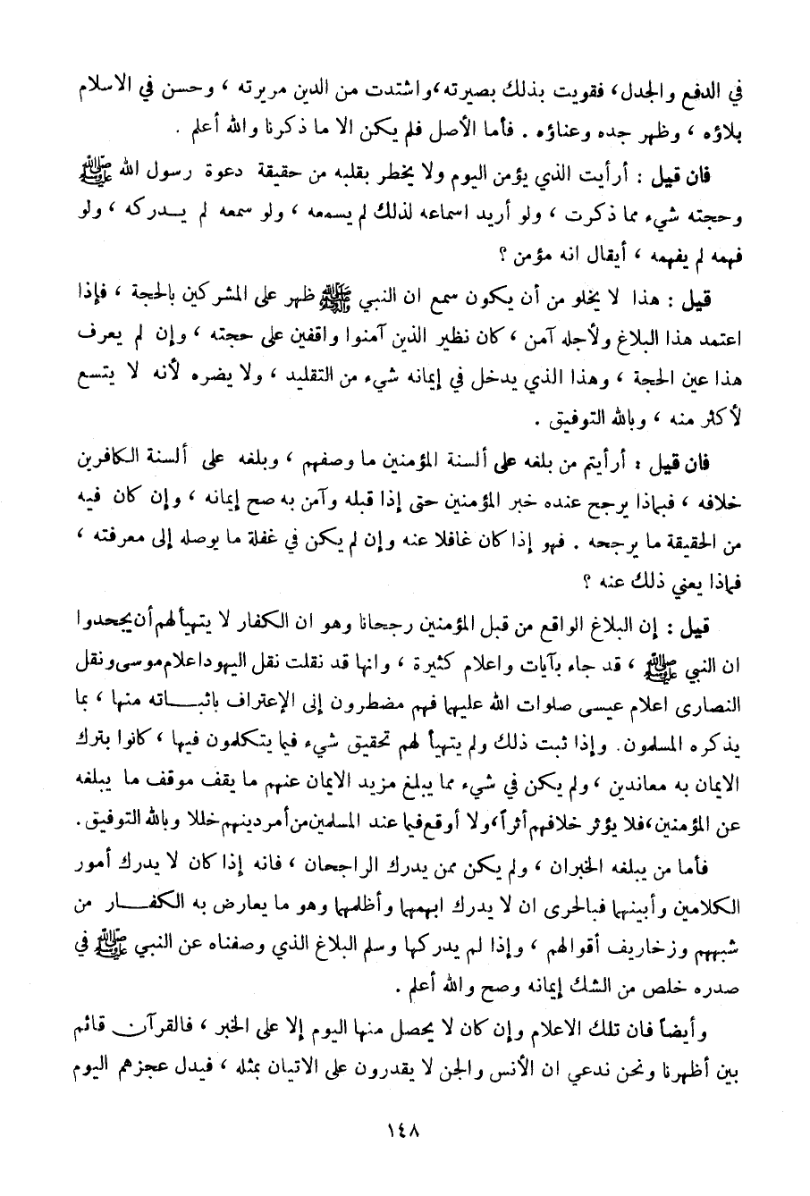 فإن قيل: أرأيت الذي يؤمن اليوم ولا يخطر بقلبه من حقيقة دعوة رسول الله صلى الله عليه وسلم وحجته شيء مما ذكرت، ولو أريد إسماعه لذلك لم يسمعه، ولو سمعه لم يدركه، ولو فهمه لم يفهمه، أيقال أنه مؤمن؟