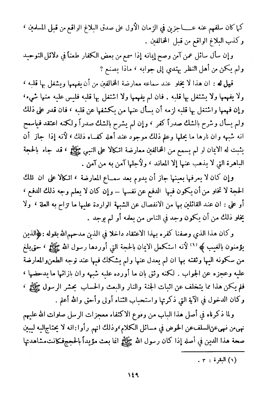 وكان هذا الذي وصفنا كفره بهذا الاعتقاد داخلا في الذين مدحهم الله بقوله: {الذين يؤمنون بالغيب} لأنه استكمل الإيمان بالحجة التي أوردها رسول الله صلى الله عليه وسلم، حتى بلغ من سكونه إليها وثقته بها أن لم يعدل عنها ولم يشكك فيها عند توجه الطعن والمعارضة عليه وعجزه عن الجواب. لكنه وثق بأن ما أورده عليه شبهه وأن بإزائها ما يدحضها، فلم يكن هذا مما يتخلف عن إثبات الجنة والنار والبعث والحساب بحشر الرسول صلى الله عليه وسلم، وكان الدخول في الآية التي ذكرتها واستحباب الثناء أولى وأحق والله أعلم.