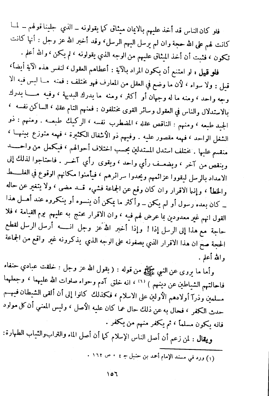 فلو كان الناس قد أخذ عليهم بالإيمان ميثاق ما يقولونه- الذي جلبنا قولهم- لما كانت لهم على الله حجة وأن لم يرسل إليهم الرسل، وقد أخبر الله عز وجل: أنها كانت تكون، فثبت أن أخذ الميثاق عليهم من الوجه الذي يقولونه، لم يكن، والله أعلم.