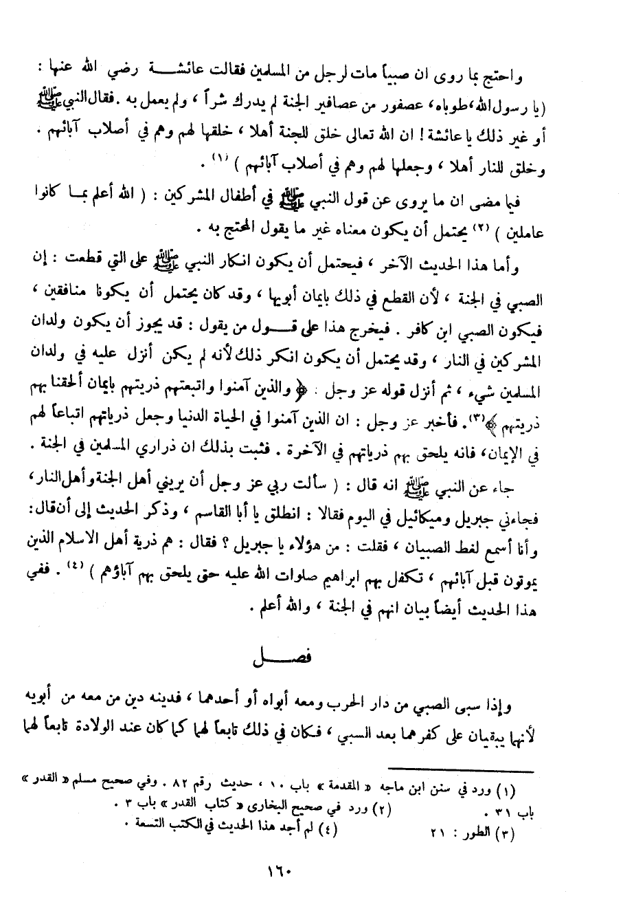 وأما هذا الحديث الأخير، فيحتمل أن يكون إنكار النبي صلى الله عليه وسلم على التي قطعت: إن الصبي في الجنة، لأن القطع في ذلك بإيمان أبويها، وقد كان يحتمل أن يكونا منافقين، فيكون الصبي ابن كافر. فيخرج هذا على قول من يقول: قد يجوز أن يكون ولدان المشركين في النار، وقد يحتمل أن يكون أنكر ذلك لأنه لم يكن أنزل عليه في ولدان المسلمين شيء، ثم أنزل قوله عز وجل: {والذين آمنوا واتبعتهم ذريتهم بإيمان ألحقنا بهم ذريتهم}. فأخبر عز وجل: أن الذين آمنوا في الحياء الدنيا وجعل ذرياتهم إتباعا لهم في الإيمان، فإنه يلحق بهم ذرياتهم في الآخرة. فثبت بذلك أن ذراري المسلمين في الجنة.