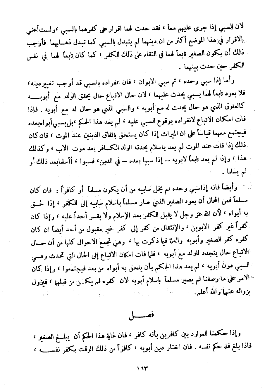 وأيضا فإنه إذا سبي وحده لم يخل سابيه من أن يكون مسلما أو كافرا: فإن كان مسلما فمن المحال أن يعود الصغير الذي صار مسلما بإسلام سابيه إلى الكفر، إذا لحق به أبواه، لأن الله عز وجل لا يقبل الكفر بعد الإسلام ولا يقر أحدا عليه، وإذا كان كفرا غير كفر الأبوين، والانتقال من كفر إلى كفر غير مقبول من أحد أيضا أن كان كفره كفر الصغير وأبويه والعلة فيما ذكرت بها، وهي تجمع الأحوال كلها من أن حال الإتباع حال يتجدد للولد مع أبويه، فلما فات أمكان الإتباع إلى الحل التي تحدث وهي السبي دون أبويه، لم يعد هذا الحكم بان يلحق به أبواه من بعد فيجتمعوا، وإذا كان الأمر على وصفنا لم يصير مسلما بإسلام أبويه لأن كفر ولم يكن من قبلهما، فيزول بزواله عنهما والله أعلم.
