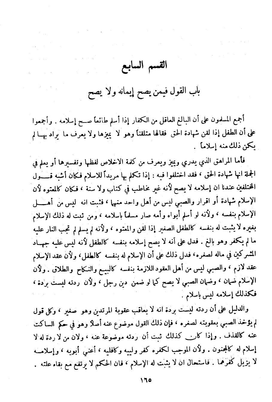 فأما المراهق الذي يدري ويميز ويعرف من كلمة الإخلاص لفظها وتفسيرها أو يعلم في الجملة أنها شهادة الحق، فقد اختلفوا فيه: إذا تكلم بها مريدا للإسلام فكان أشبه قول المختلفين عندنا أن إسلامه لا يصلح لأنه غير مخاطب في كتاب ولا سنة، فكان كالمعتوه لأن الإسلام شهادة أو إقرار والصبي ليس من أهل واحد منهما، فثبت انه ليس من أهل الإسلام بنفسه، ولأنه لو أسلم أبواه وأمه صار مسلما بإسلامه، ومن ثبت له ذلك الإسلام بغيره لا يثبت له بنفسه كالطفل الصغير إذا لقن والمعتوه، ولأنه لم يسلم لم تجب النار عليه ما لم يكفر وهو بالغ. فدل على أنه لا يصح إسلامه بنفسه كالطفل لأنه ليس عليه جهاد المشركين في ماله لصغره، فدل ذلك على أن الإسلام له بنفسه كالطفل، ولأن عقد الإسلام عقد لازم، والصبي ليس من أهل العقود اللازمة بنفسه كالبيع والنكاح والطلاق. ولأن الإسلام ضمان، وضمان الصبي لا يصح كما لو ضمن دين رجل، ولأن ردته ليست بردة، فكذلك إسلامه ليس بإسلام.