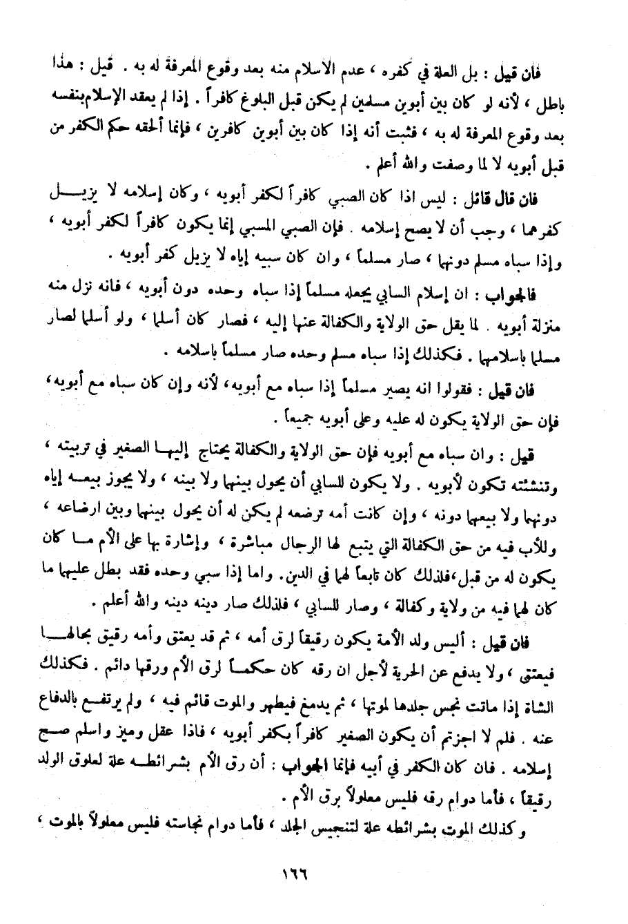 فإن قيل: بل العلة في كفره، عدم الإسلام منه بعد وقوع المعرفة له به. قيل: هذا باطل، لأنه لو كان بين أبوين مسلمين لم يكن قبل البلوغ كافرا. إذا لم يعقد الإسلام بنفسه بعد وقوع المعرفة له به، فثبت أنه إذا كان بين أبوين كافرين، فإنما ألحقه حكم الكفر من قبل أبويه لا لما وصفت والله أعلم.