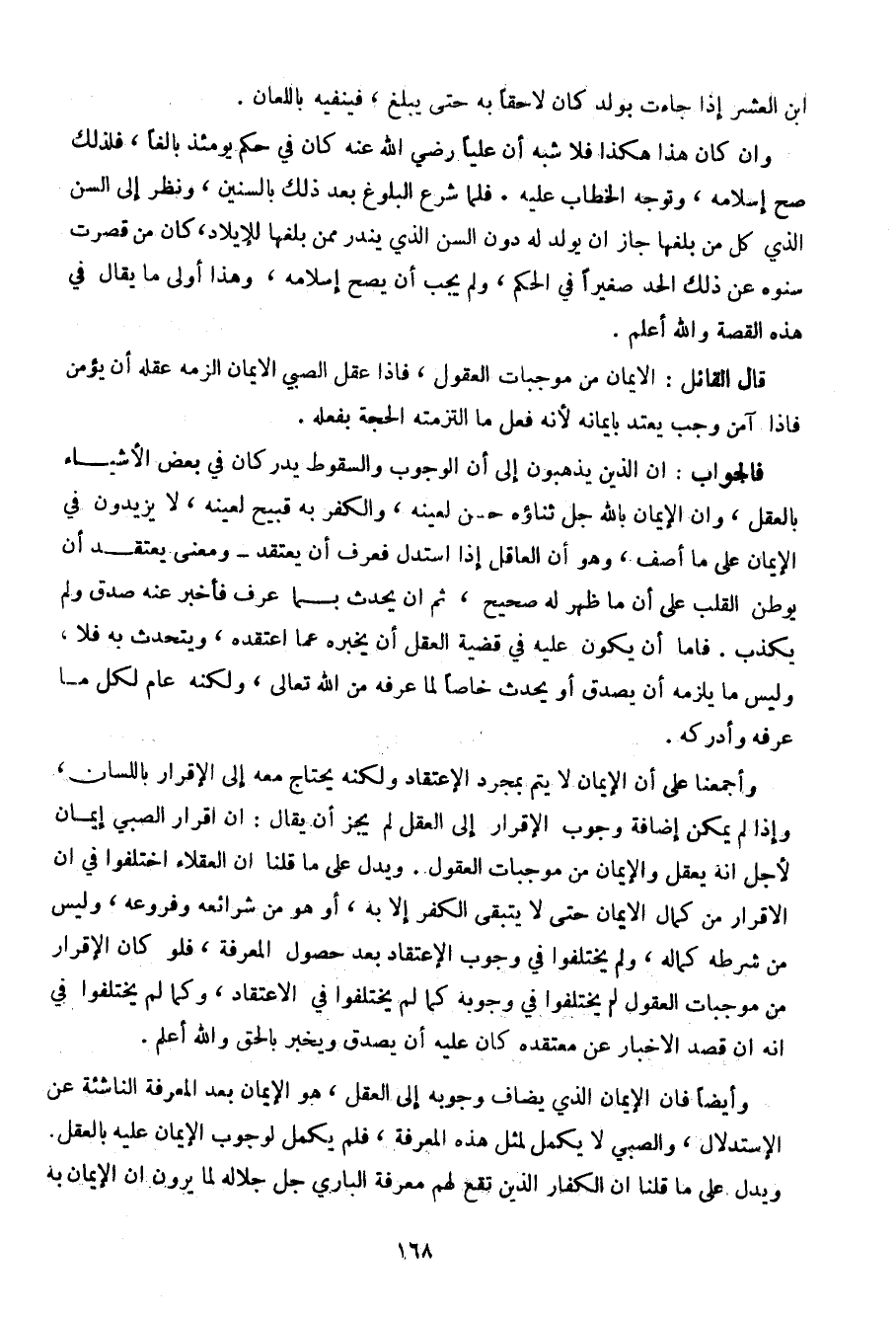 وأيضا فإن الإيمان الذي يشاق وجوبه إلى العقل، هو الإيمان بعد المعرفة الناشئة عن الاستدلال، والصبي لا يكمل لمثل هذه المعرفة، فلم يكمل لوجوب الإيمان عليه بالعقل. ويدل على ما قلنا أن الكفار الذين تقع لهم معرفة الباري جل جلالة لما يرون أن الإيمان به