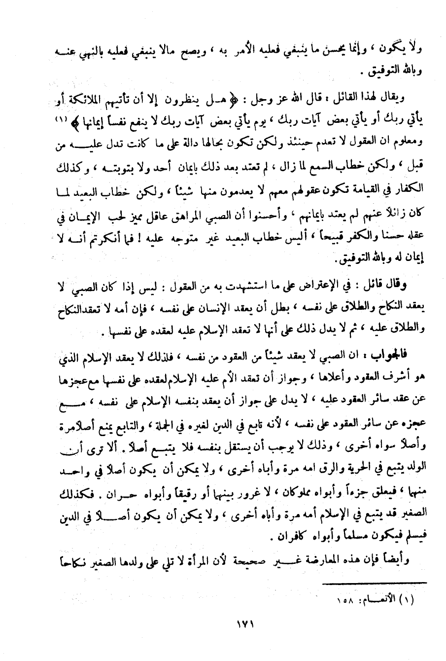ويقال لهذا القائل: قال الله عز وجل: {هل ينظرون إلا أن تأتيهم الملائكة أو يأتي ربك أو يأتي بعض آيات ربك، يوم يأتي بعض آيات ربك لا ينفع نفسا إيمانها} ومعلوم أن العقول لا تعدم حينئذ ولكن تكون بحالها دالة على ما كانت تدل عليه من قبل، ولكن خطاب السمع لما زال، لم تعتد بعد ذلك بإيمان أحد ولا بتوبته، وكذلك الكفار في القيامة تكون عقولهم معهم لا يعدمون منها شيئا، ولكن خطاب البعيد لما كان زائلا عنهم لم يعتد بإيمانهم، وأحسنوا أن الصبي المراهق عاقل مميز لحب الإيمان في عقله حسنا والكفر قبيحا، أليس خطاب البعيد غير متوجه عليه! فما أنكرتم أنه لا إيمان له وبالله التوفيق.