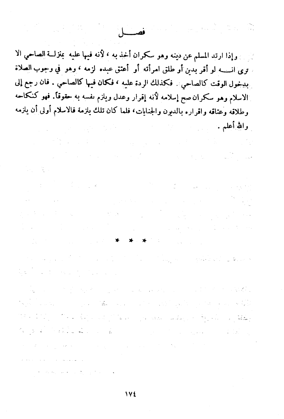 وإذا ارتد المسلم عن دينه وهو سكران أخذ به، لأنه فيها عليه بمنزلة الصاحي إلا ترى أنه لو أقر بدين أو طلق امرأته أو أعتق عبده لزمه، وهو في وجوب الصلاة بدخول الوقت كالصاحي. فكذلك الردة عليه، فكان فيها كالصاحي. فإن رجع إلى الإسلام وهو سكران صح إسلامه لأنه إقرار وعدل ويلزم نفسه به حقوقا. فهو كنكاحه وطلاقه وعتاقه وإقراره بالديون والجنايات، فلما كان تلك يلزمه فالإسلام أولى أن يلزمه والله أعلم.