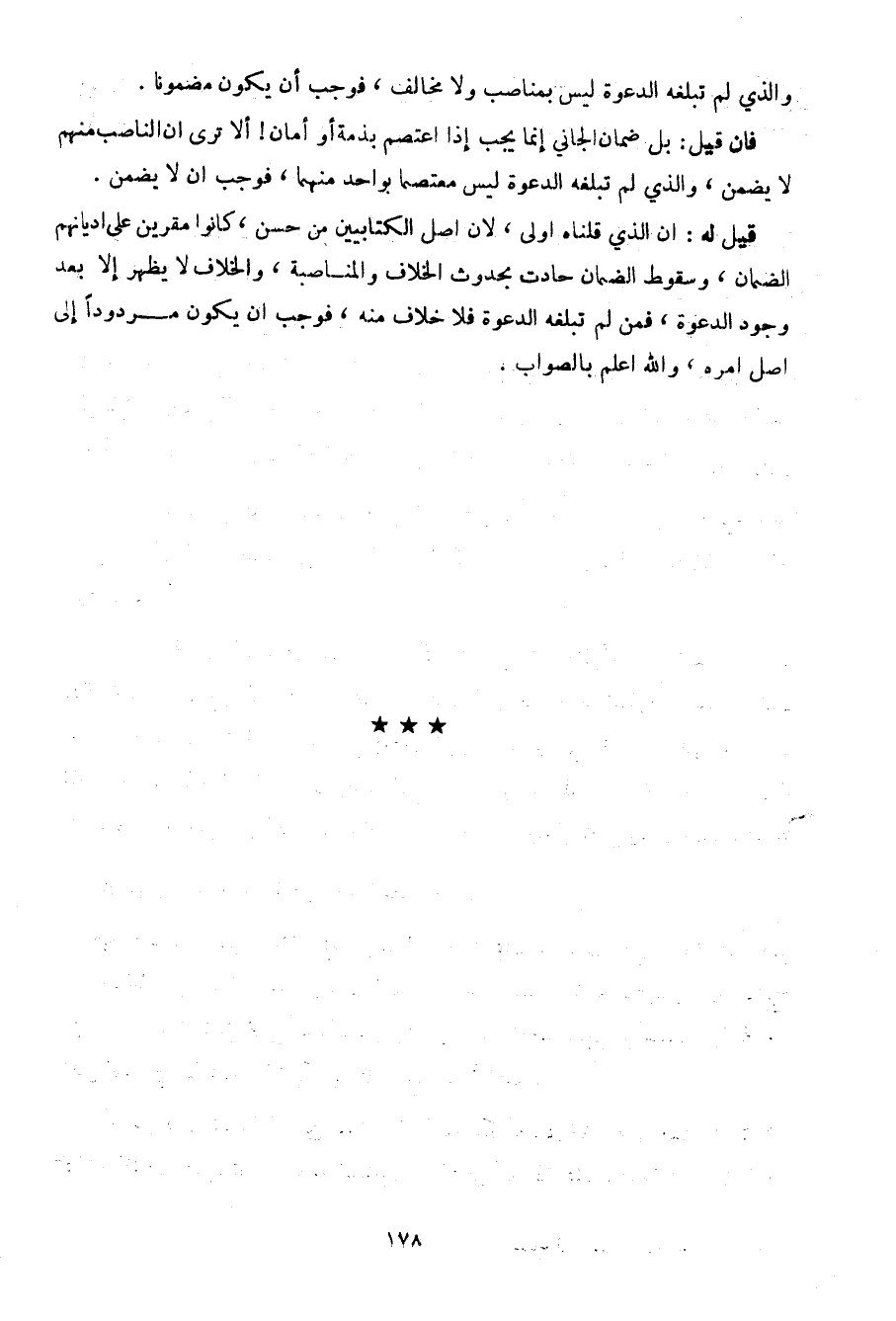 قيل له: أن الذي قلناه أولى، لأن أصل الكتابين من حسن، كانوا مقرين على أديانهم الضمان، وسقوط الضمان حادث بحدوث الخلاف والمناصبة، والخلاف لا يظهر إلا بعد وجود الدعوة، فمن لم تبلغه الدعوة فلا خلاف منه، فوجب أن يكون مردودا إلى أصل أمره، والله أعلم بالصواب.