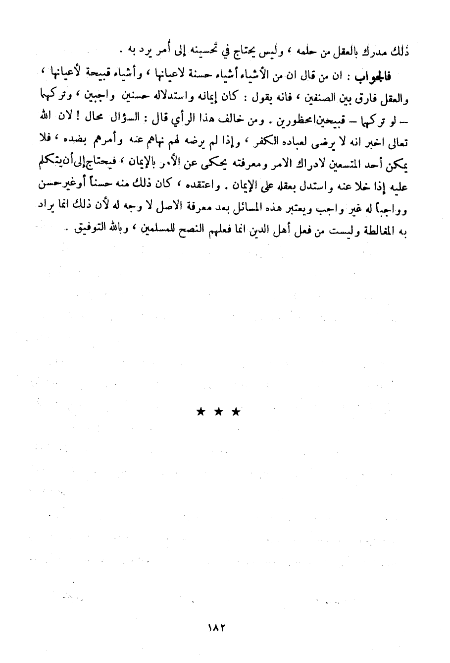 فالجواب: أن من قال أن من الأشياء أشياء حسنة لأعيانها، وأشياء قبيحة لأعيانها، والعقل فارق بين الصنفين، فإنه يقول: كان إيمانه واستدلاله حسنين واجبين، وتركهما- لو تركهما- قبيحين محظورين. ومن خالف هذا الرأي قال: السؤال محال! لأن الله تعالى اخبر أنه لا يرضى لعبادة الكفر، وإذا لم يرضه لهم نهاهم عنه وأمرهم بضده، فلا يمكن أحد المستعين لإدراك الأمر ومعرفته يحكى عن الأمر بالإيمان، فيحتاج إلى أن يتكلم عليه إذا خلا عنه واستدل بعقله على الإيمان. واعتقده، كان ذلك منه حسنا أو غير حسن وواجبا له غير واجب ويعتبر هذه المسائل بعد معرفة الأصل لا وجه له لأن ذلك إنما يراد به المغالطة وليست من فعل أهل الدين إنما فعلهم النصح للمسلمين، وبالله التوفيق.