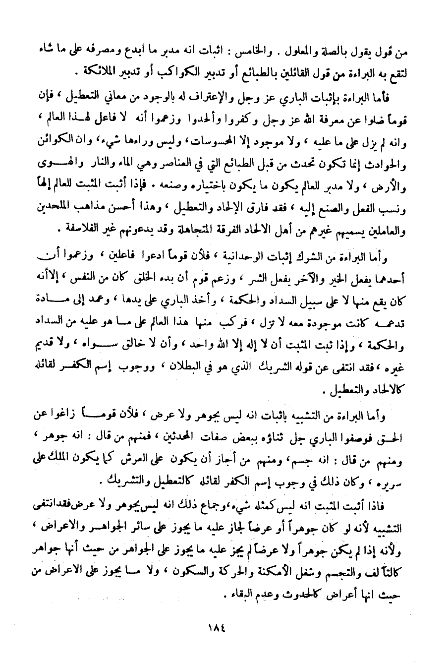 من قول يقول بالصلة والمعلول. والخامس: إثبات أنه مدبر ما أبدع ومصرفه على ما شاء لتقع به البراءة من قول القائلين بالطبائع أو تدبير الكواكب أو تدبير الملائكة.