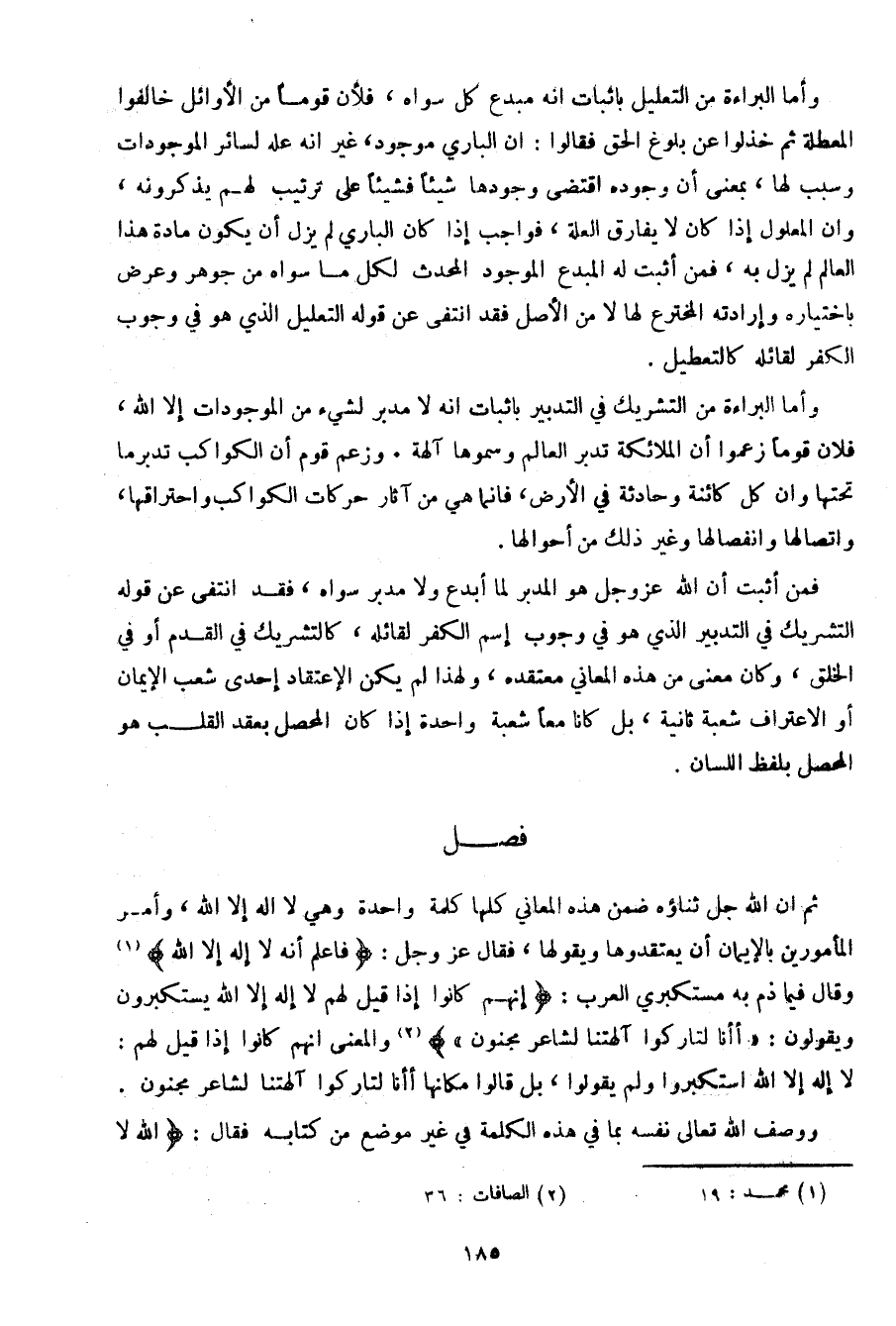 ثم أن لله جل ثناؤه ضمن هذه المعاني كلها كلمة واحدة وهي لا إله إلا الله، وأمر المأمورين بالإيمان لأن يعتقدوها ويقولها، فقال عز وجل: {فاعلم أنه لا إله إلا الله} وقال فيما ذم به مستكبري العرب: {إنهم كانوا إذا قيل لهم لا إله إلا الله يستكبرون ويقولون: "أأنا لتاركوا إلهتنا لشاعر مجنون"} والمعنى أنهم كانوا إذا قيل لهم: لا إله إلا الله استكبروا ولم يقولوا، بل قالوا مكانها أأنا لتاركوا آلهتنا لشاعر مجنون.