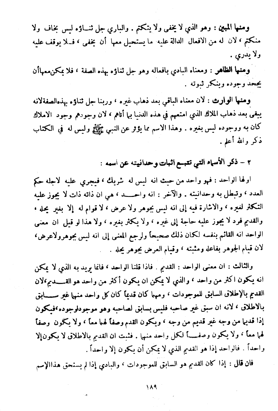 أو لها الواحد: فهو واحد من حيث أنه ليس له شريك، فيجري عليه لأجله حكم العدد، وتبطل به وحدانيته. والآخر: أنه واحد، هي أن ذاته ذات لا يجوز عليه التكثر لغيره، والإشارة فيه إلى أنه ليس بجوهر ولا عرض، له قوام له إلا بغير يحله، والقديم فرد لا يجوز عليه حاجة إلى غيره، ولا يكثر بغيره، ولا هذا لو قيل أن معنى الواحد انه القائم بنفسه لكان ذلك صحيحا ولرجع المعنى إلى انه ليس بجوهر ولا عرض، لأن قيام الجوهر بفاعله ومثبته، وقيام العرض بجوهر يحله.