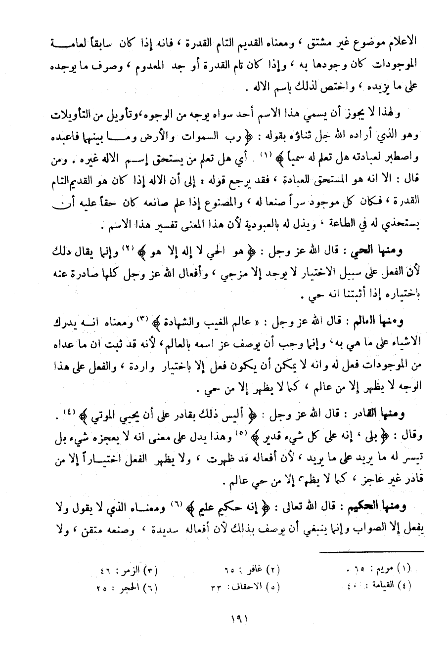 ومنها الحي: قال الله عز وجل: {هو الحي لا إله إلا هو} وإنما يقال ذلك لأن الفعل على سبيل الاختيار لا يوحد إلا مزجي، وأفعال الله عز وجل لها صادرة عنه باختياره إذا أثبتنا أنه حي.