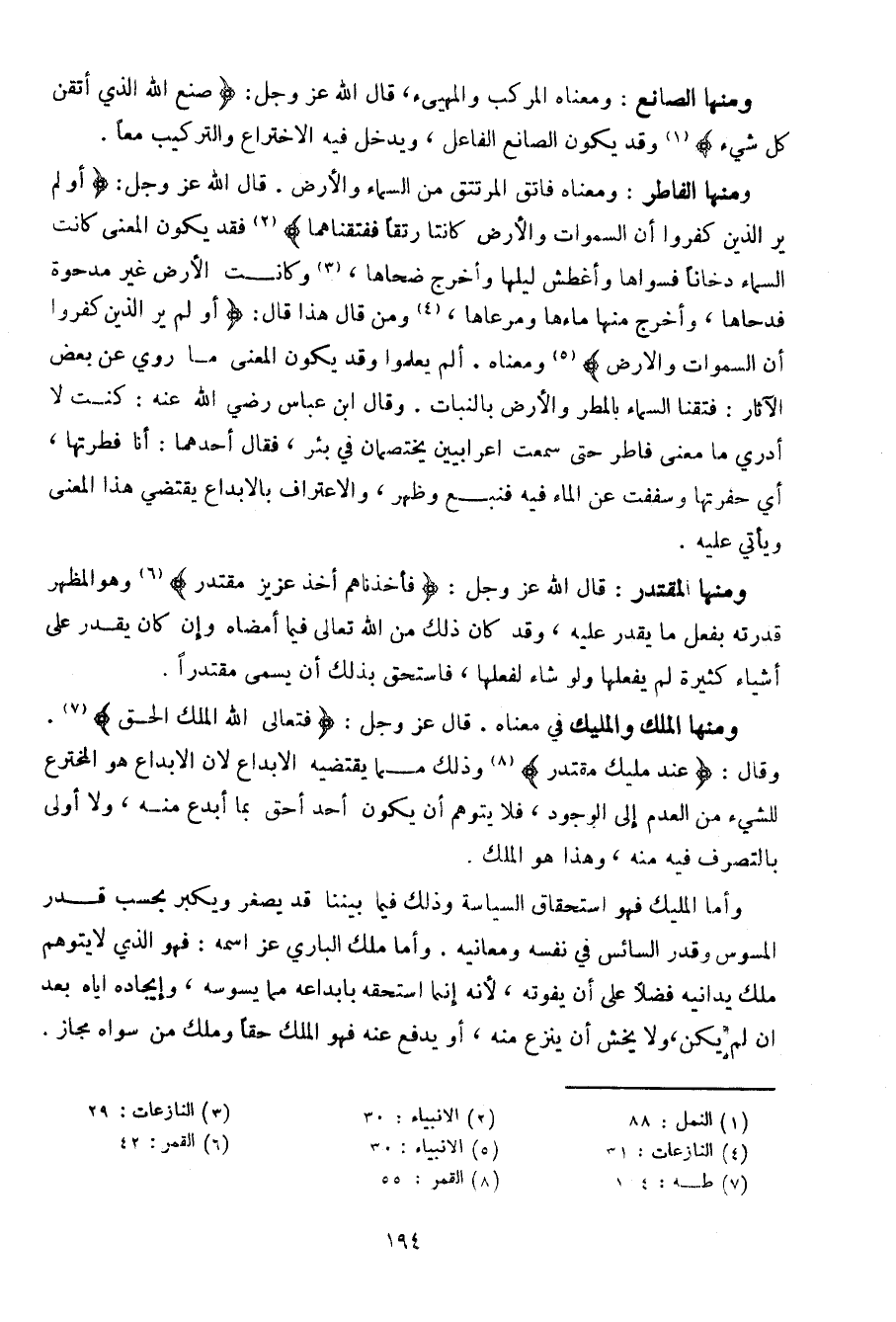 ومنها الملك والمليك في معناه. قال عز وجل: {فتعالى الله الملك الحق}. وقال: {عند مليك مقتدر} وذلك مما يقتضيه الإبداع هو المخترع للشيء من العدم إلى الوجود، فلا يتوهم أن يكون أحد أحق بما أبدع منه، ولا أولى بالتصرف فيه منه، وهذا هو الملك.
