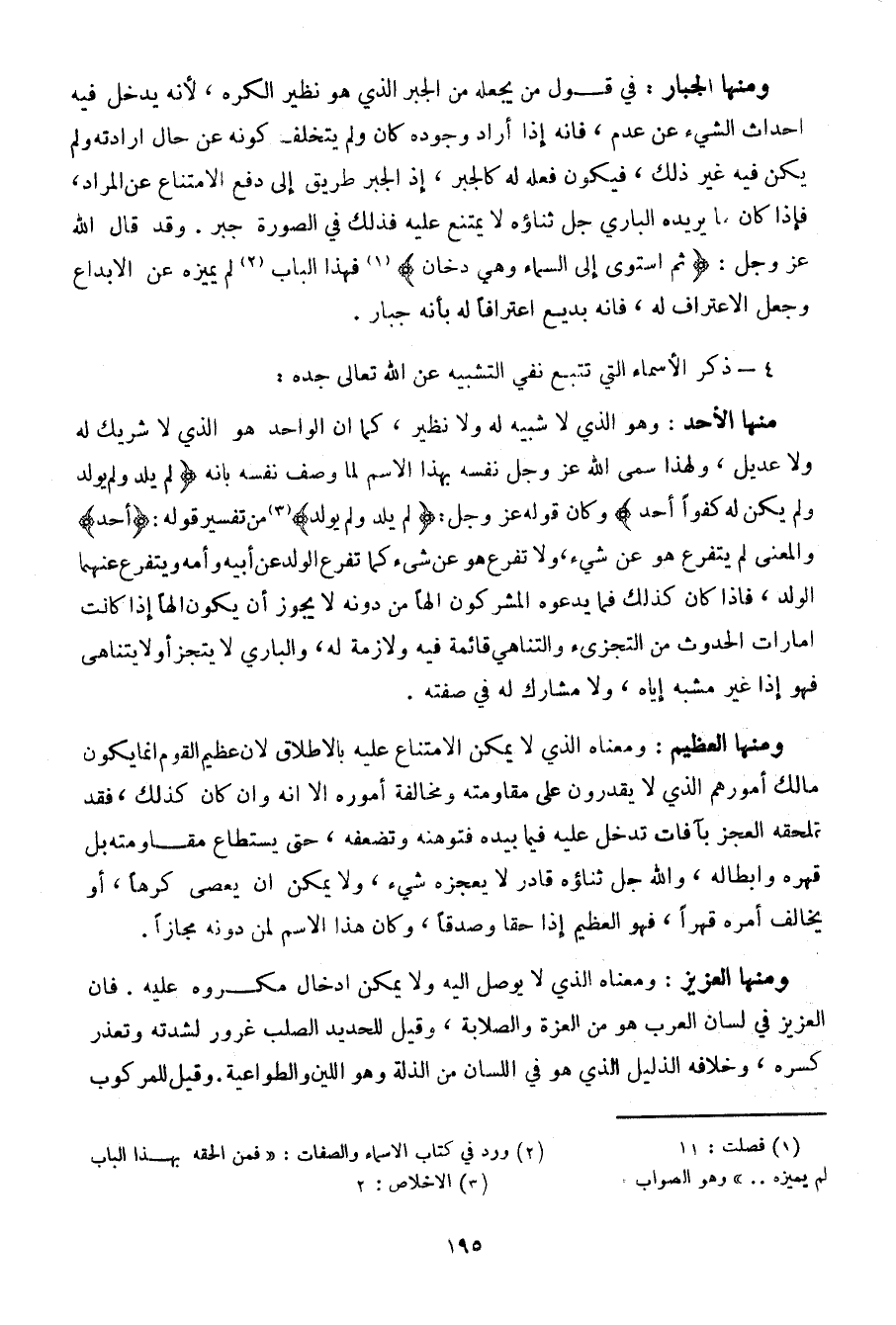 منها الأحد: وهو الذي لا شبيه له ولا نظير، كما أن الواحد هو الذي لا شريك له ولا عديل، ولهذا سمي الله عز وجل نفسه بهذا الاسم لما وصف نفسه بأنه {لم يلد ولم يولد ولم يكن له كفوا أحد} وكان قوله عز وجل: {لم يلد ولم يولد} من تفسير قوله: {أحد} والمعنى لم يتفرع هو عن شيء، ولا تفرع هو عن شيء كما تفرع الولد عن أبيه وأمه ويتفرع عنهما الولد، فإذا كان ذلك فيما يدعوه المشركون الها من دونه لا يجوز أن يكون الها إذا كانت إمارات الحدوث من التجزئ والتناهي قائمة فيه ولازمة له، الباري لا يتجزأ ولا يتناهى فهو إذا غير مشبه إياه، ولا مشارك له في صفته.