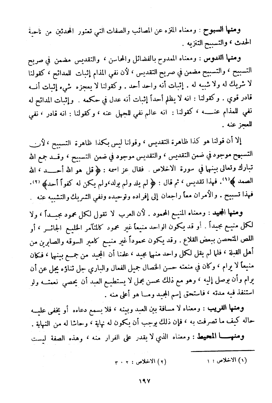 إلا أن قولنا هو كذا ظاهرة التقديس، وقولنا ليس بكذا ظاهرة التسبيح، لأن التسبيح موجود في ضمن التقديس، والتقديس موجود في ضمن التسبيح، وقد جمع الله تبارك وتعالى بينهما في سورة الإخلاص. فقال عز اسمه: {قل هو الله أحد، الله الصمد}. فهذا تقديس، ثم قال: {لم يلد ولم يولد، ولم يكن له كفوا أحد}. فهذا تسبيح. والأمران معا راجعات إلى إفراده وتوحيده ونفي الشريك والتشبيه عنه.