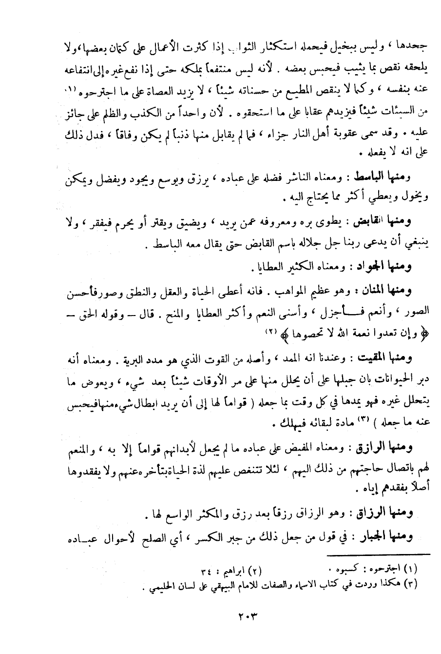 ومنها المقيت: وعندنا أنه الممد، وأصله من القوت الذي هو مدد البرية. ومعناه أنه دبر الحيوانات بان جبلها على أن يحلل منها على مر الأوقات شيئا بعد شيء، ويعوض ما يتحلل غيره فهو يمدها في كل وقت بما جعله "قواما لها إلى أن يريد إبطال شيء منها فيحبس عنه ما جعله" مادة لبقائه فيهلك.