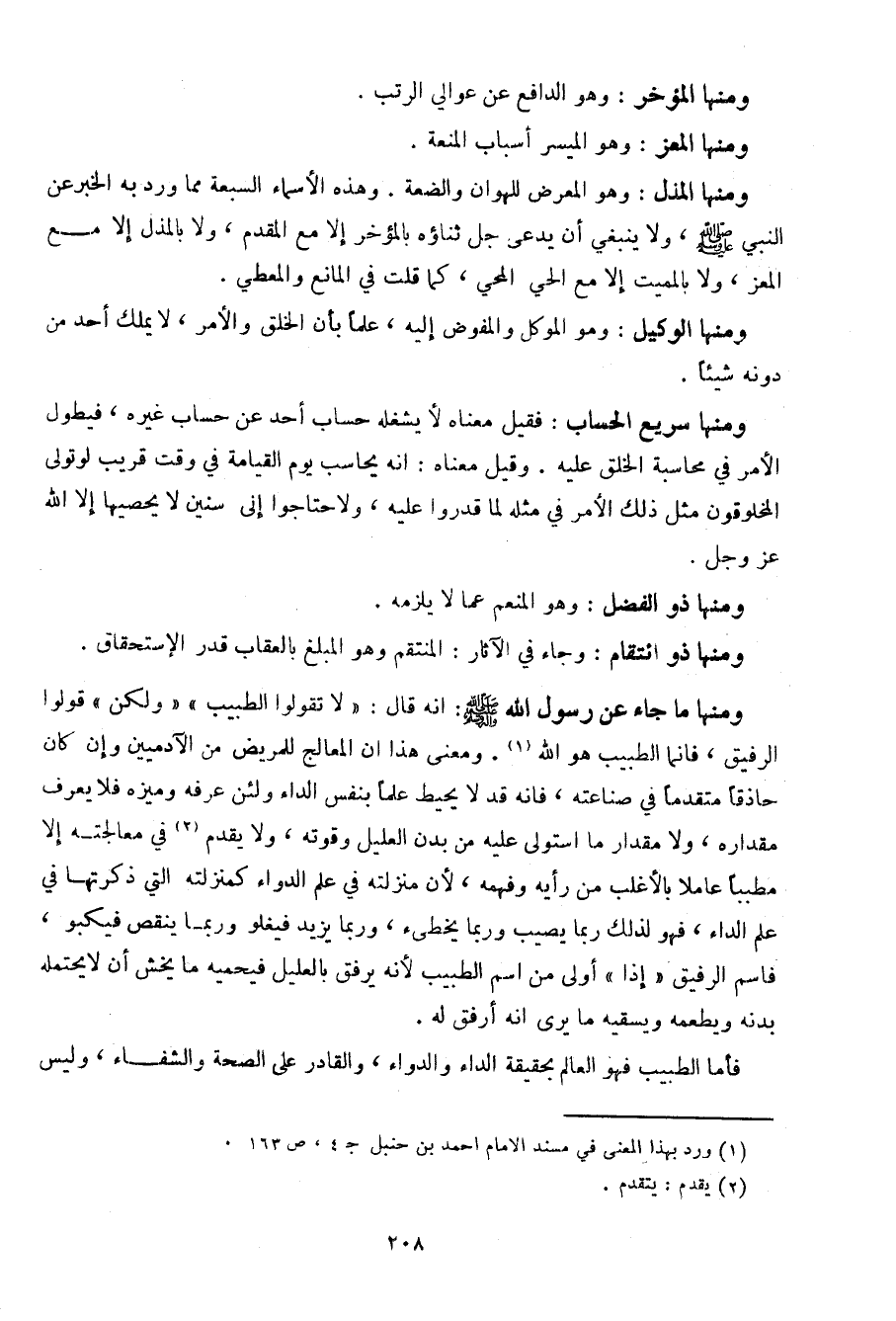ومنها ما جاء عن رسول الله صلى الله عليه وسلم: أنه قال: "لا تقولوا الطبيب" "ولكن" قولوا الرفيق، فإنما الطبيب هو الله. ومعنى هذا أن المعالج للمريض من لآدميين وإن كان حاذقا متقدما في صناعته، فإنه قد لا يحيط علما بنفس الداء ولثن عرفه وميزه فلا يعرف مقداره، ولا مقدار ما استولى عليه من بدن العليل وقوته، ولا يقدم في معالجته إلا مطببا عاملا بالأغلب من رأيه وفهمه، لأن منزلته في علم الدواء كمنزلته التي ذكرتها في علم الداء، فهو لذلك ربما يصيب وربما يخطئ، وربا يزيد فيغلو وربما ينقص فيكبو، فاسم الرفيق "إذا" أولى من اسم الطبيب لأنه يرفق بالعليل فيحميه ما يخش أن لا يحتمله بدنه ويطعمه ويسقيه ما يرى أنه أرفق له.