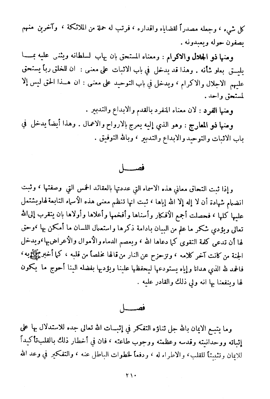 وإذا ثبت التحاق معاني هذه الأسماء التي عددتها بالعقائد الخمس التي وصفتها، وثبت انضمام شهادة أن لا إله إلا الله إياها، ثبت أنها تنظم معنى هذه الأسماء التابعة لها ويشتمل عليها كلها، فحصلت أجمع الأفكار وأسناها وأفخمها وأعلاها وأولاها بأن يتقرب إلى الله تعالى ويؤدي شكر ما علم من البيان بادامة ذكرها واستعمال اللسان ما أمكن بها، وحق لها أن تدعى كلمة التقوى كما دعاها الله، ويعصم الدماء والأموال والأعراض بها، ويدل الجنة من كانت آخر كلامه، وتزحزح عن النار من قالها مخلصا من قلبه، كما أخبر صلى الله عليه وسلم به، فالحمد لله الذي هدانا وإياه يستودعها ليحفظها علينا ويؤديها بفضله إليه أحوج ما يكون لها وينفعنا بها أنه ولي ذلك والقادر عليه.