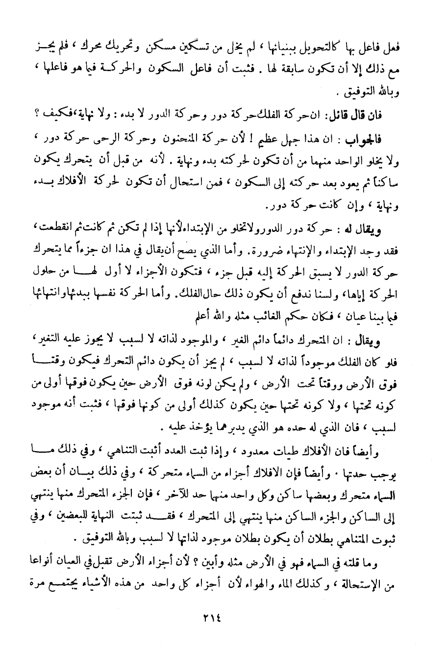 فإن قال قائل: أن حركة الفلك حركة دور وحركة الدور لا بدء: ولا نهاية، فكيف؟