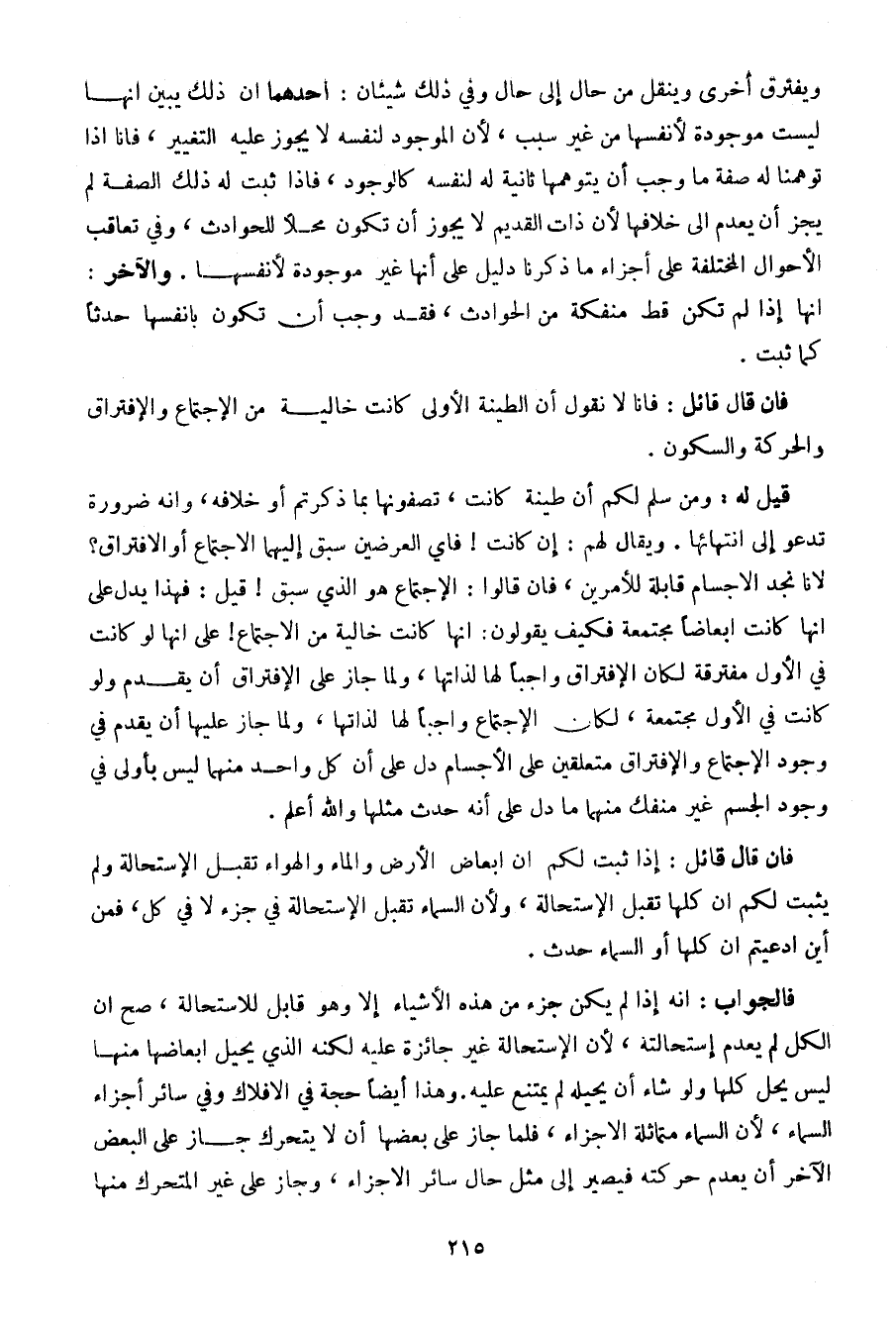 ويفترق أخرى وينقل من حال إلى حال وفي ذلك شيئان: أحدهما أن ذلك يبين أنها لست موجودة لأنفسها من غير سبب، لأن الموجود لنفسه لا يجوز عليه التغيير، فانا إذا توهمنا له صفة ما وجب أن يتوهمها ثانية له لنفسه كالوجود، فإذا ثبت له ذلك الصفة لم يجز أن يعدم إلى خلافها لأن ذات القديم لا يجوز أن تكون محلا للحوادث، وفي تعاقب الأحوال المختلفة على أجزاء ما ذكرنا دليل على أنها غير موجودة لأنفسها. والآخر: أنها إذا لم تكن قط منفكة من الحوادث، فقد وجب أن تكون بأنفسها حدثا كما ثبت.