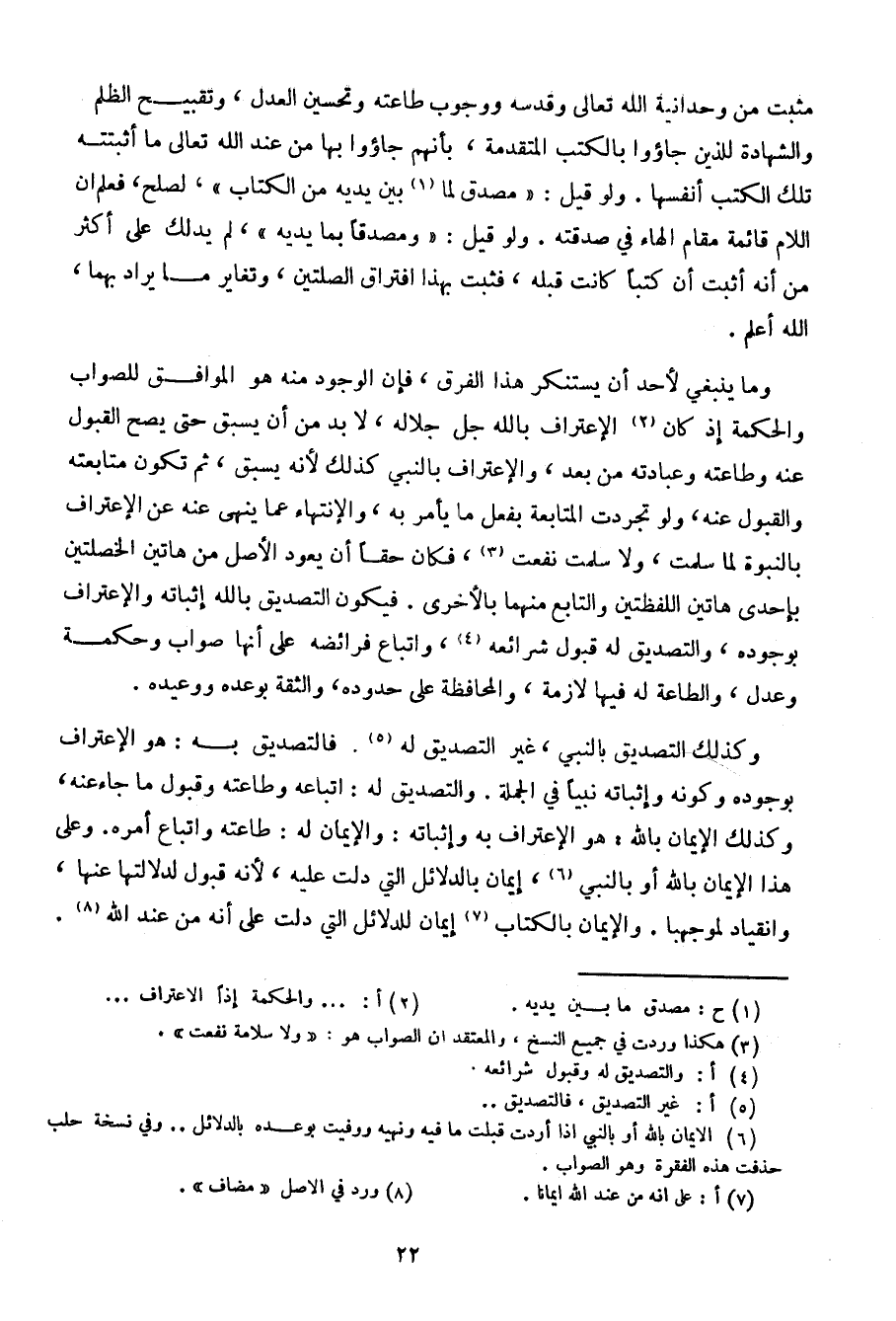 وما ينبغي لأحد أن يستنكر هذا الفرق، فإن الوجود منه هو الموافق للصواب والحكمة إذ كان الاعتراف بالله جل جلاله، لابد من أن يسبق حتى يصح القبول عنه وطاعته وعبادته من بعد، والاعتراف بالنبي كذلك لأنه يسبق، ثم تكون متابعته والقبول عنه، ولو تجردت المتابعة بفعل ما يأمر به، والانتهاء عما ينهي عنه عن الاعتراف بالنبوة لما سلمت، ولا سلمت نفعت، فكان حقا أن يعود الأصل من هاتين الخصلتين بإحدى هاتين اللفظتين والتابع منهما بالأخرى. فيكون التصديق بالله إثباته والاعتراف بوجوده، والتصديق له قبول شرائعه، وإتباع فرائضه على أنها صواب وحكمة وعدل، والطاعة فيها لازمة، والمحافظة على حدوده، والثقة بوعده ووعيده.