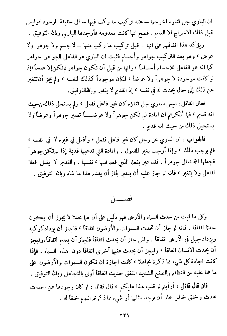 فالجواب: أن الباري عز وجل كان غير فاعل ففعل، وأفعل في غيره لا في نفسه، فلم يوجب ذلك، وإنما أوجب بغير المفعول. والمادة التي تدعيها قديمة إذا لم تكن جوهرا فجعلها الله تعالى جوهرا. فقد عبر بفعله الذي فعله فيها، نفسها. والقديم لا يقبل فعلا لفاعل ولا يتغير، فإنه لو جاز عليه أن يتغير لجاز أن يقدم هذا ما شاء وبالله التوفيق ..